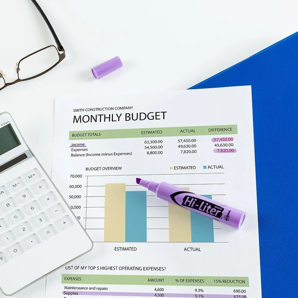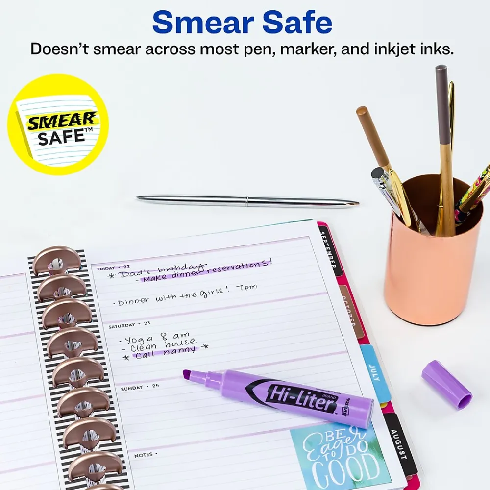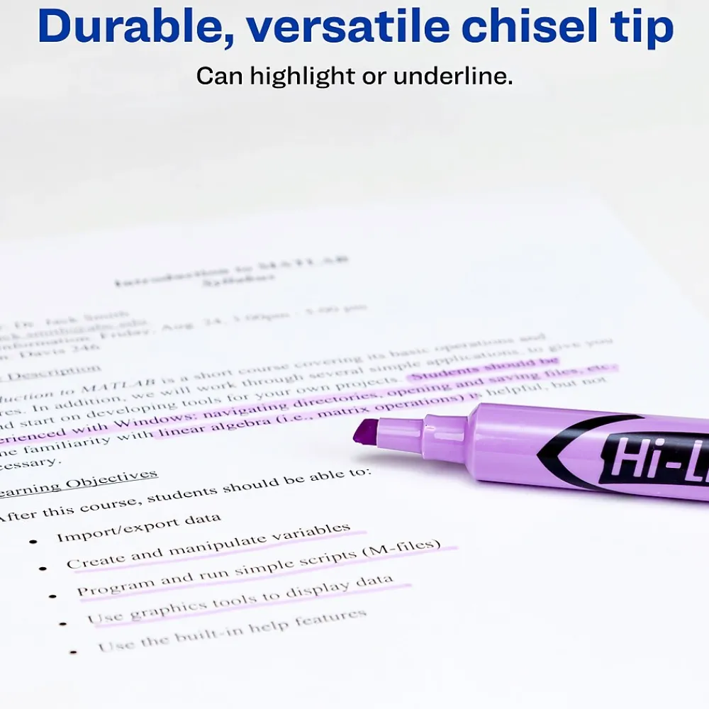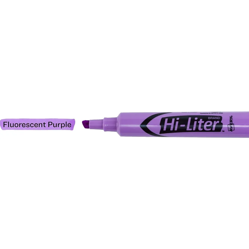 Prepare notes for studying or research with these desk-style highlighters The bright purple ink stands out on the page, while the chisel tips let you create fine or broad lines. These Avery Hi-Liter chisel-tip highlighters feature washable ink, preventing stains and messes.