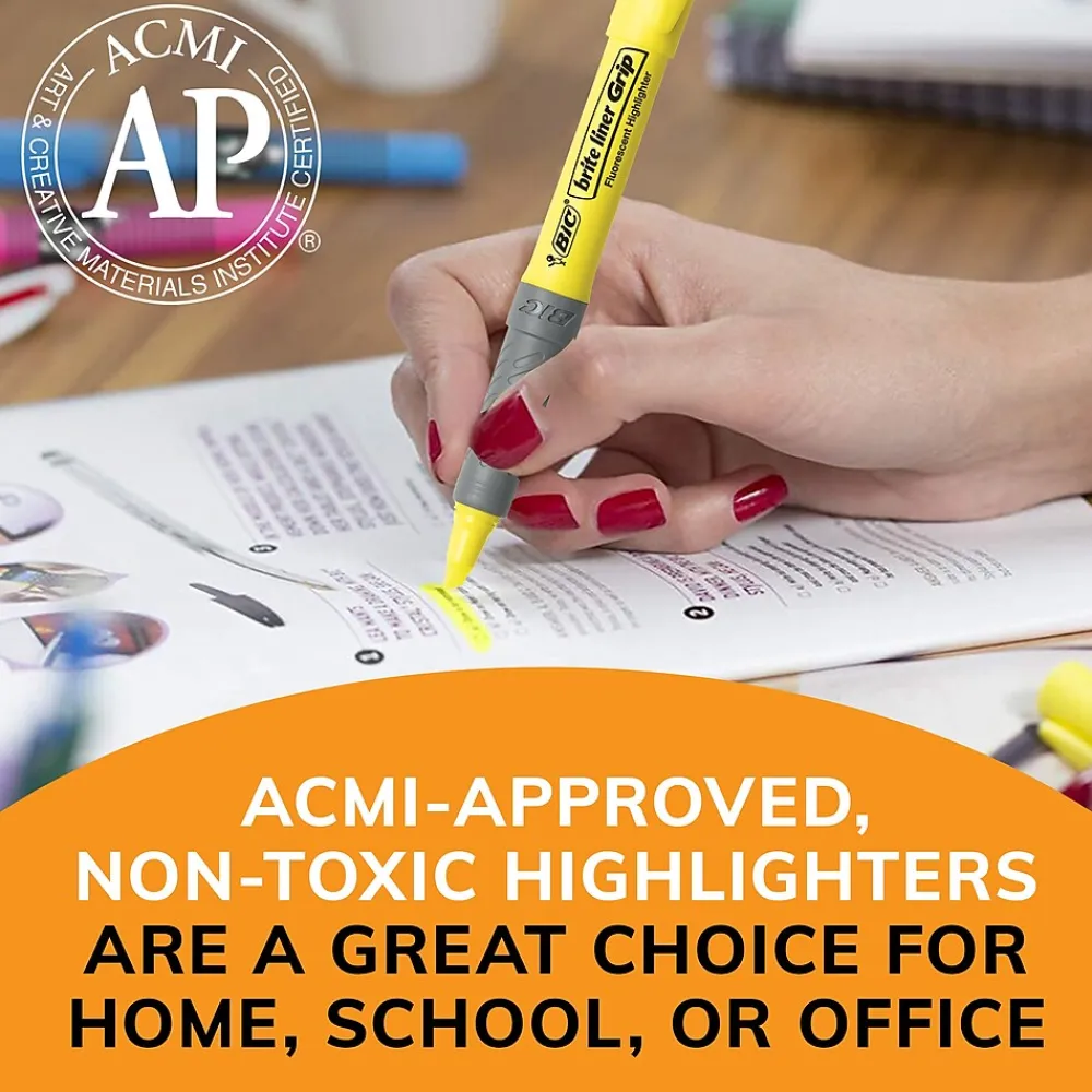 Create broad strokes or fine lines in a variety of colors with BIC Brite liner grip highlighters. Whether you need to highlight large blocks of text or create annotations and corrections with a fine line, the chisel tip provides versatility, clarity and control. The rubberized grip is easy on hands and wrists, maximizing comfort and productivity. Choose from five bright and bold colors to easily color-code tasks or departments. Quick-drying BIC Brite liner grip highlighters won’t smudge your important documents.
