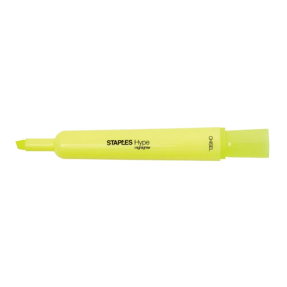Make precise marks on faxes, photocopies, and other documents with these chisel tank highlighters. Each one has a long-lasting quick-drying ink supply and features a chisel tip, producing precise and detailed marks. These Staples Hype tank highlighters come in a pack of 12, are AP-certified nontoxic and are a transparent yellow color, letting you easily see text that you have highlighted over.