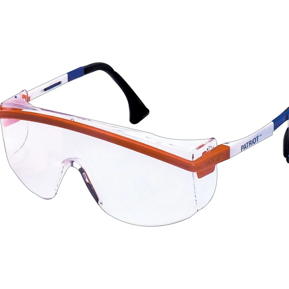Sperian® ANSI Z87 Astrospec 3000® Safety glasses in clear color with red/white/blue frame have adjustable temple length and lens inclination for convenience. Glasses feature wrap-around single lens that provides full panoramic view.