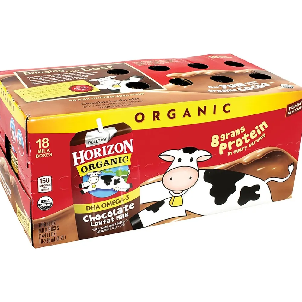 Looking for a healthy, organic drink to get you through the day? Horizon Organic Chocolate Low-Fat Milk Boxes, 8 fl oz, 18 Count has 8 grams of protein and is a great source of Vitamins A and D. With no artificial colors, flavors or preservatives, this lowfat chocolate milk is a delicious way to take in DHA Omega-3. Each box contains 18 8 fluid oz milk boxes. Great for packing in your lunch to avoid sugary drinks at the office, Horizon Organic Chocolate Low-Fat Milk Boxes, 8 fl oz, 18 Count is exactly what you need for a healthier you!