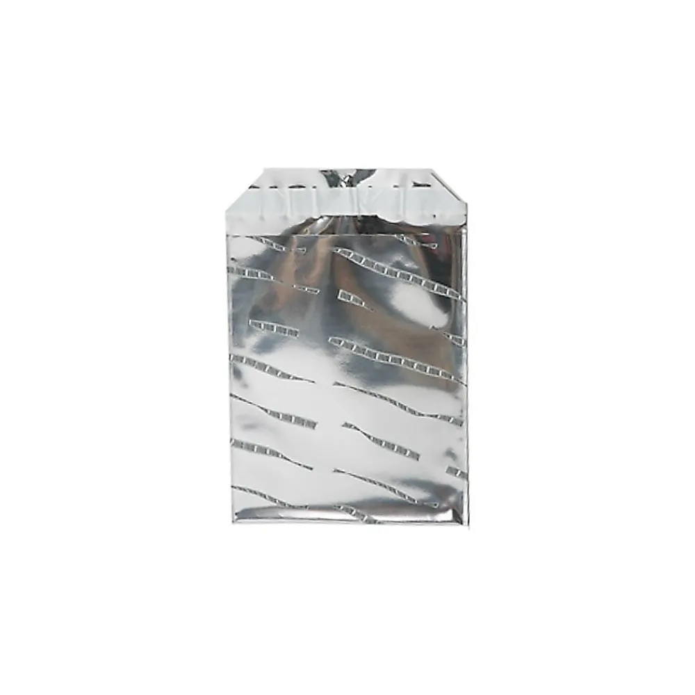 JAM PaperĀ® Silver Film Open End Foil Envelopes with Self Adhesive Closures measure 6 1/4 x 7 7/8 inches in size and are made out of durable, light weight and pliable plastic based foil material. This pack contains a total of 25 envelopes! Each one features a bright and shiny silver color with a metallic foil finish and a pattern of grey and white strips of film. These envelopes keep the contents placed inside of them secure with angled straight flaps and reliable self adhesive peel-and-seal closures! Use these unique envelopes to brightly and festively package and give away photos, small reels of film, and much more!