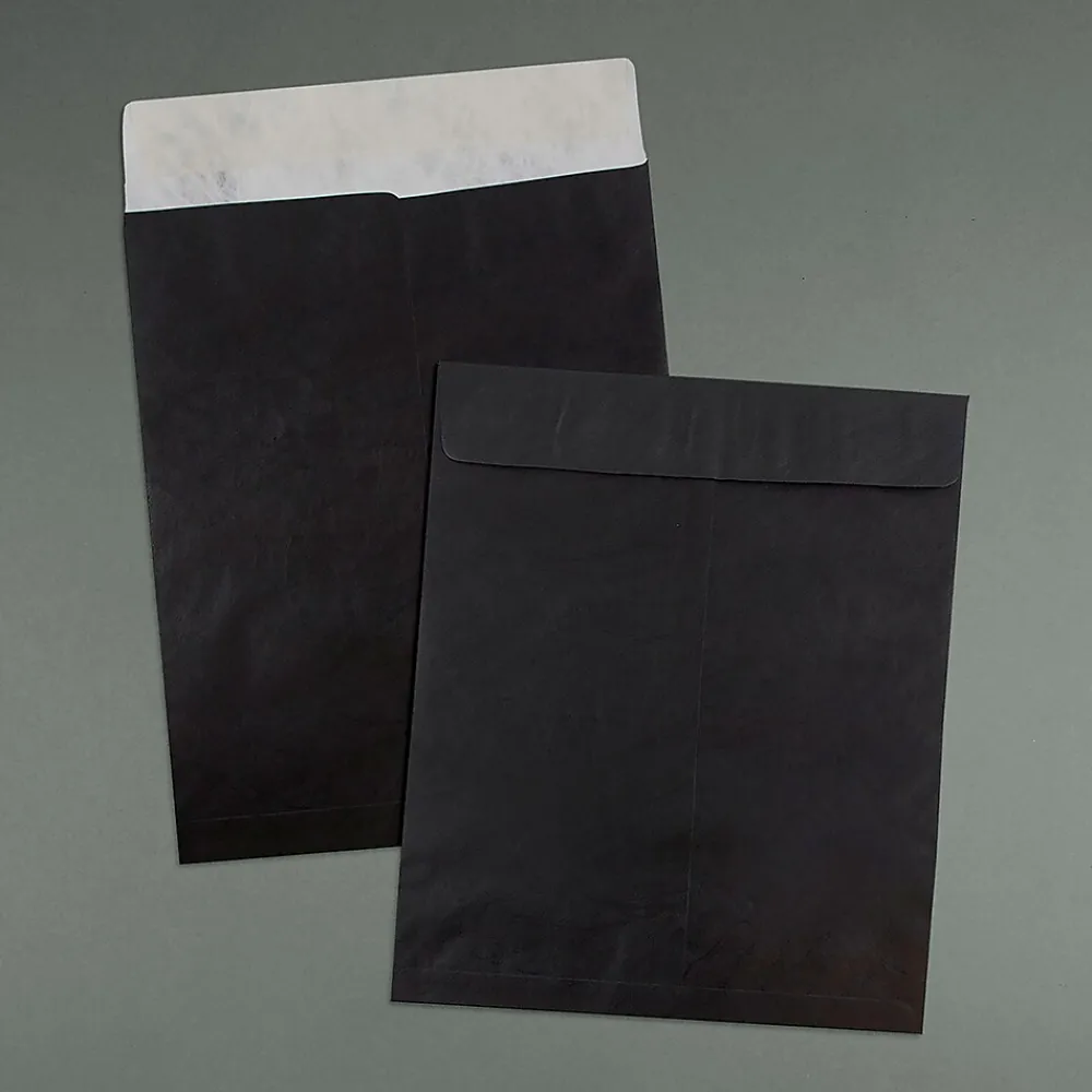 Choose JAM Paper® Heavy Duty Tyvek® Open End Catalog Envelopes to deliver your mail in style. Recipients will be impressed when they receive this black envelope in the mail and find that the contents are in perfect condition. Water and tear-resistant, spills and wet weather won’t be able to damage your artwork, magazines, or brochures. This pack contains 10 black Tyvek® envelopes. Each envelope measures 11 1/2″ x 14 1/2″, has an open end opening (no clasp, gummed), straight flap, self adhesive strip closure, is made from 28 lb. paper, is 10% recycled, and has a smooth finish.