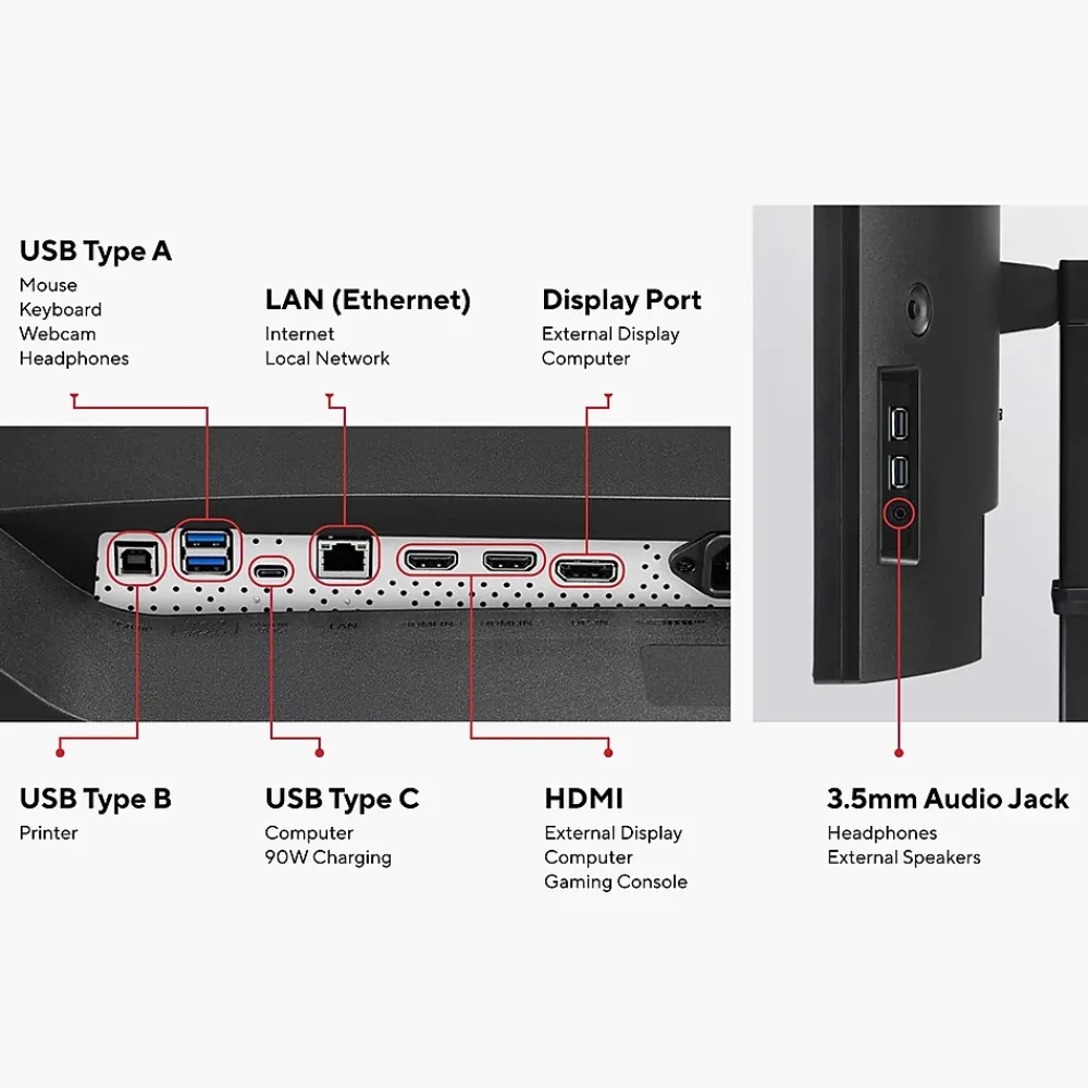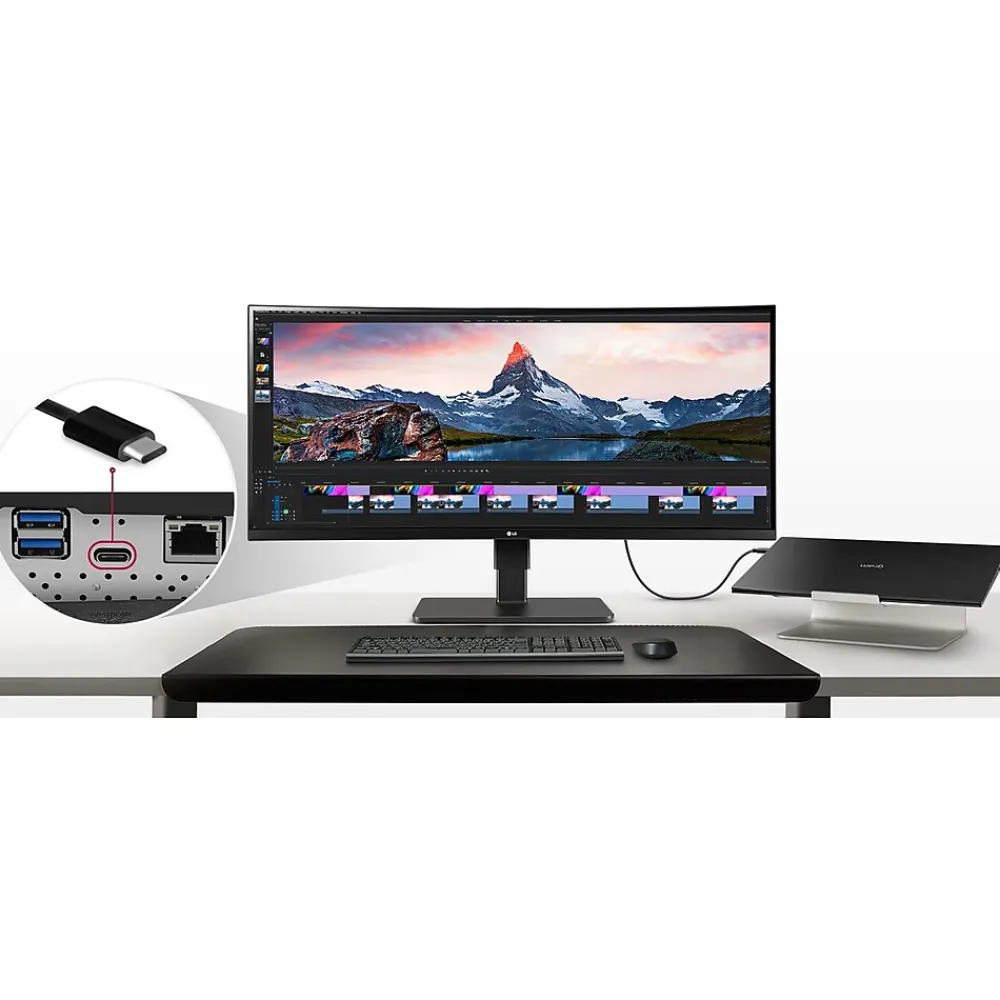 Experience unparalleled productivity and convenience with the LG 34″ UltraWide™ Curved Monitor. Boasting a stunning Wide Quad High Definition (WQHD) 3440 x 1440 resolution and a wide 21:9 aspect ratio, this monitor is designed to enhance your workflow. Its integrated universal docking station simplifies connectivity, featuring USB Type-C™, DisplayPort, HDMI, RJ45 (Ethernet), USB (1Up/4Down), and Headphone ports for seamless integration with your devices. With one USB Type-C cable, you can power your laptop from this monitor! The built-in speakers deliver exceptional sound quality with MaxxAudio technology, ensuring clear communication during meetings. The monitor’s ergonomic One-Click stand allows for effortless installation and customization of height and tilt, providing the perfect viewing angle for maximum comfort. Upgrade your workspace with UltraWide™ Curved Monitor and elevate your performance.