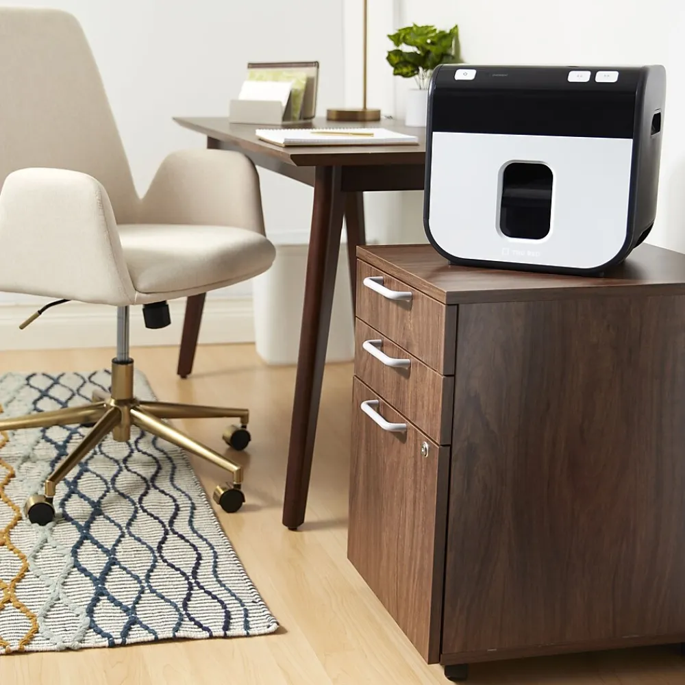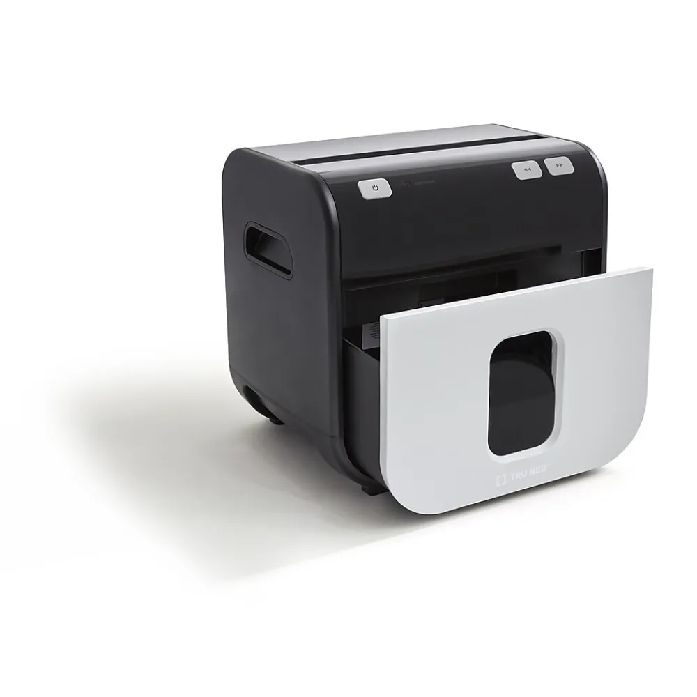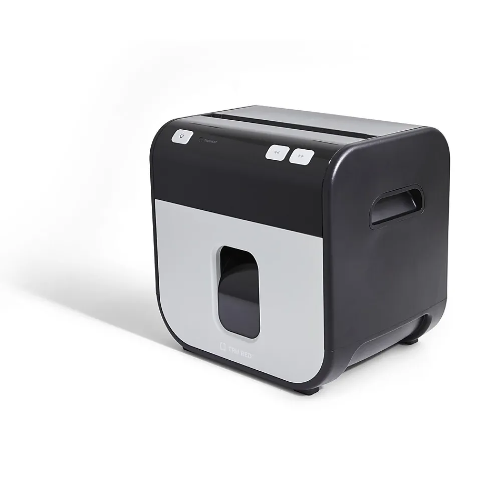 TRU RED™ Mailmate is the perfect solution for today’s home or small office shredding needs. The compact size allows placement on counters, desktops, or under tables or worksurfaces. A powerful motor shreds paper, cards, and CD’s down to 4mm x 12mm particles, giving you the security demanded by today’s business world. The 1.4 gallon waste bin has an easy to view side window, letting you see when to empty at a glance.
