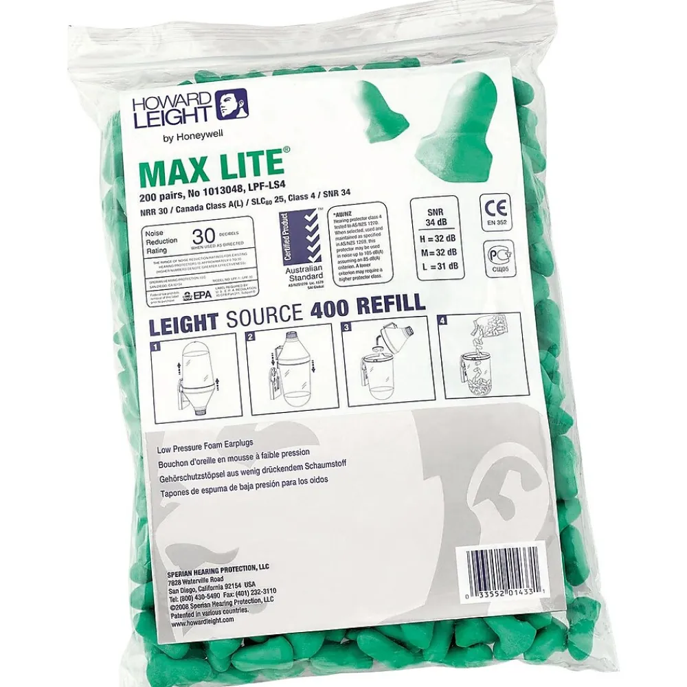 Howard Leightning® Maximum Lite® Uncorded disposable earplugs in green color provide protection from noise up to 30 dB. Earplugs have self-adjusting polyurethane foam that expands for a snug fit, sold as 200 per box.