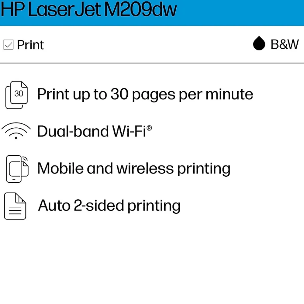 HP LaserJet M209dw Wireless Black & White Laser Printer, Single-Function, Print, Best for Home Office (6GW62F)
