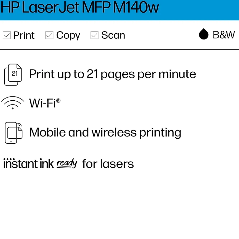 The world’s smallest multifunction laser printer in its class, the HP LaserJet MFP M140w is perfect for printing black & white forms and documents, plus scan/copy. It offers high-speed printing, seamless setup and reliable connectivity.