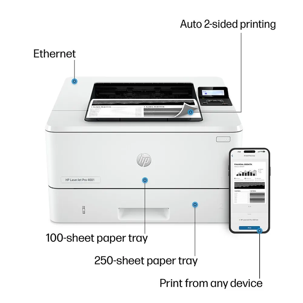 The LaserJet Pro 4001dn delivers laser quality black & white printing for all your business documents. Get ultra-fast speeds, auto 2-sided printing, and powerful productivity with advanced features for small teams. Share among users on your office network with wired ethernet connectivity.