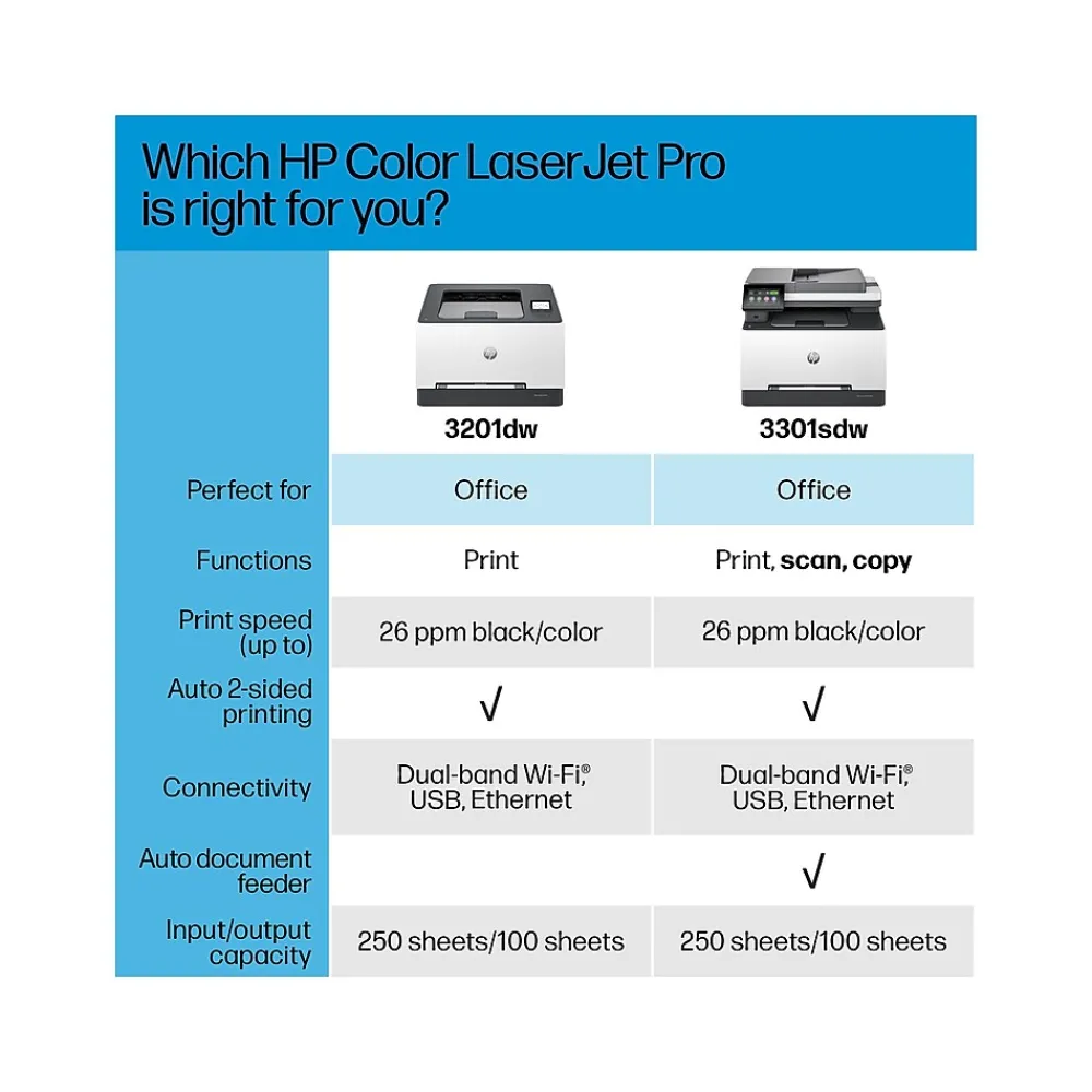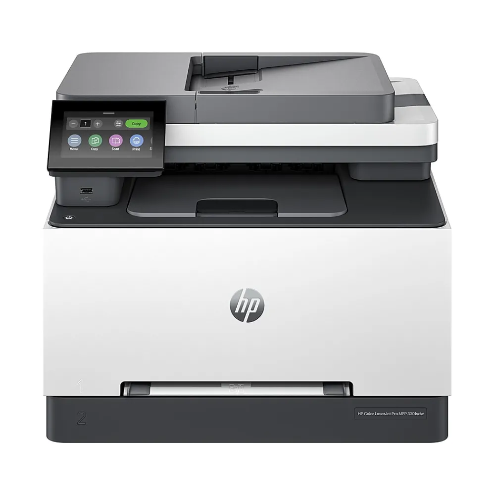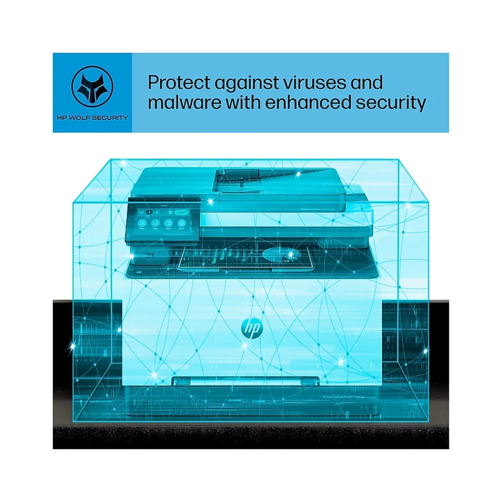 Ideal for offices, get vibrant laser-quality color and powerful productivity with the Color LaserJet Pro MFP 3301sdw. This all-in-one color laser printer is loaded with features and incredible speed perfect for offices. Print, scan and copy from anywhere with HP app. Connect via wireless or ethernet with the 3301sdw, an mfp that has built-in Wi-FiĀ® and HP Wolf Pro to keep your information secure.