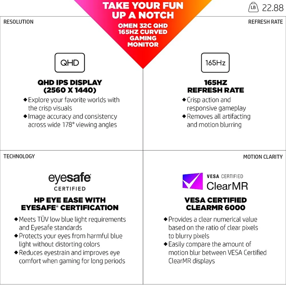 - To keep things flowing, this display features a fast 165Hz refresh rate that reduces motion blur, so every pixel keeps up with you