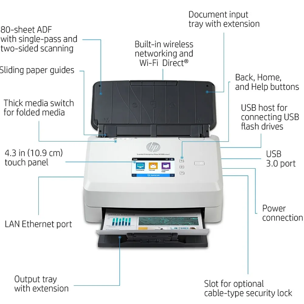 Give your office high-volume scanning performance with this HP ScanJet Enterprise Flow desktop scanner. HP Scan Premium helps you save time and capture confidently. Achieve black-and-white scan speeds up to 75 ppm/150 ipm. Recommended for 7500 pages per day.