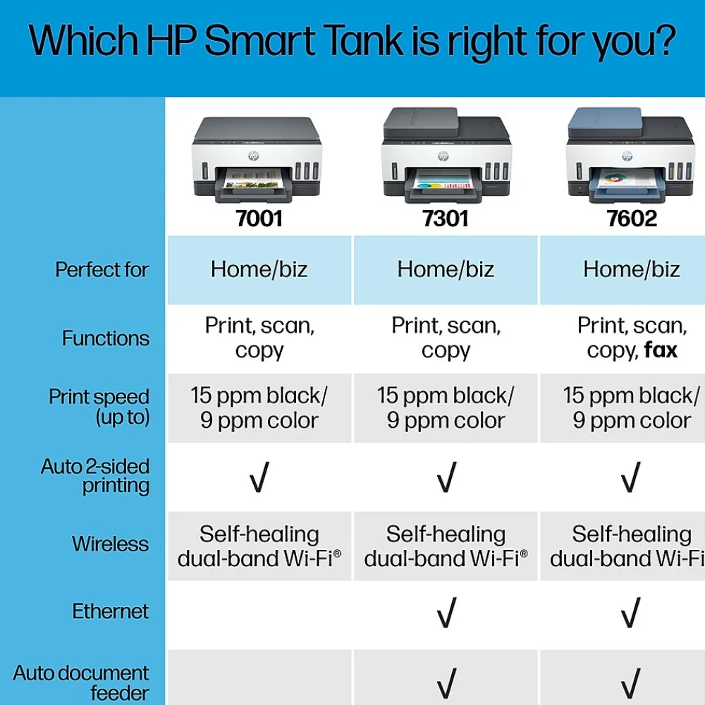 The HP Smart Tank 7602 Ink Tank Printer is a smart, connected and refillable tank printer that makes printing seamless for your home and small business with its high capacity, wireless connectivity and Ethernet networking. Create everyday color documents at a low cost with 2 years of Original HP Ink included in the box. This printer is an all-in-one inkjet perfect for high-volume color printing, scanning, copying and fax.
