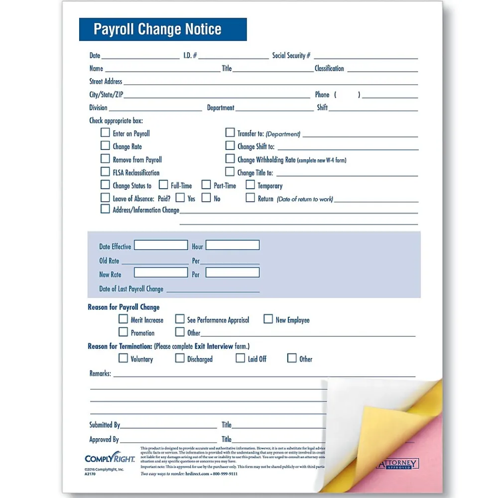 For all the status changes that can occur with employees, you’ve got them covered with the ComplyRight Payroll Change Notice. This 3-part form keeps you organized by recording dozens of personnel changes – from FLSA reclassification, a new address, job title or insurance status to transfers, promotions and salary increases. It also includes separate sections for recording new hire information or the details surrounding a leave of absence or separation.
