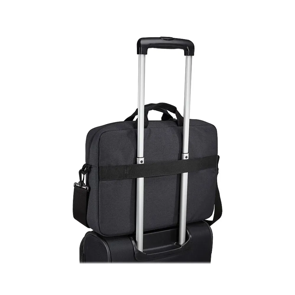Contemporary design and relevant features combine to deliver a stylish attache perfect for work or school. The Case Logic Huxton attache protects your 15.6″ laptop and tablet. It features multiple zippered pockets to store accessories, a removable shoulder strap that adjusts for a custom fit, and a luggage strap that securely attaches this slim case to most rolling luggage. Its durable polyester material withstands your ever-changing schedule. Features padded carry handles for comfortable transportation.