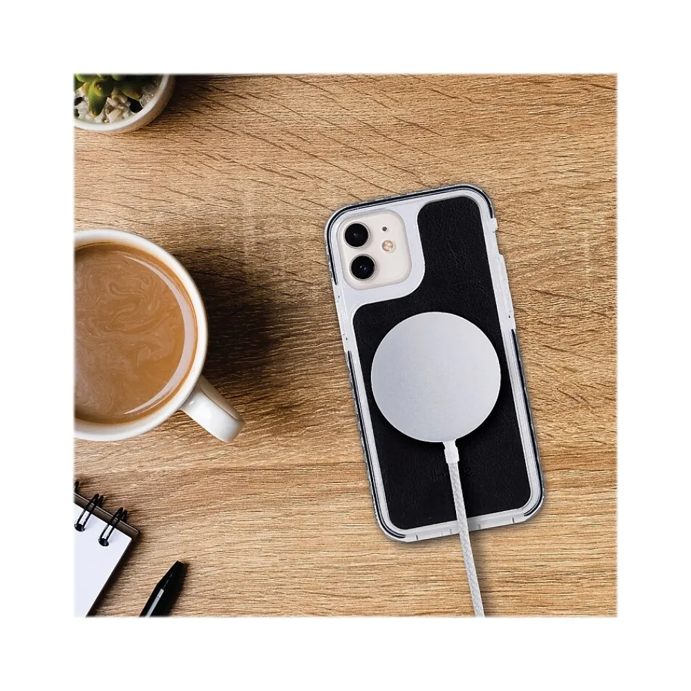 This iHome Velo case with built-in magnet securely attaches to magnetic chargers and other accessories. Made of vegan leather and durable silicone and features shock-absorbing bumpers to protect your phone.