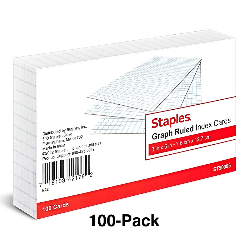 Stock your office supplies closet with this large pack of white index cards. The grid ruling lets you easily write down mathematical equations and graphs. These sturdy Staples 3″ x 5″ white graph-ruled index cards withstand frequent handling.