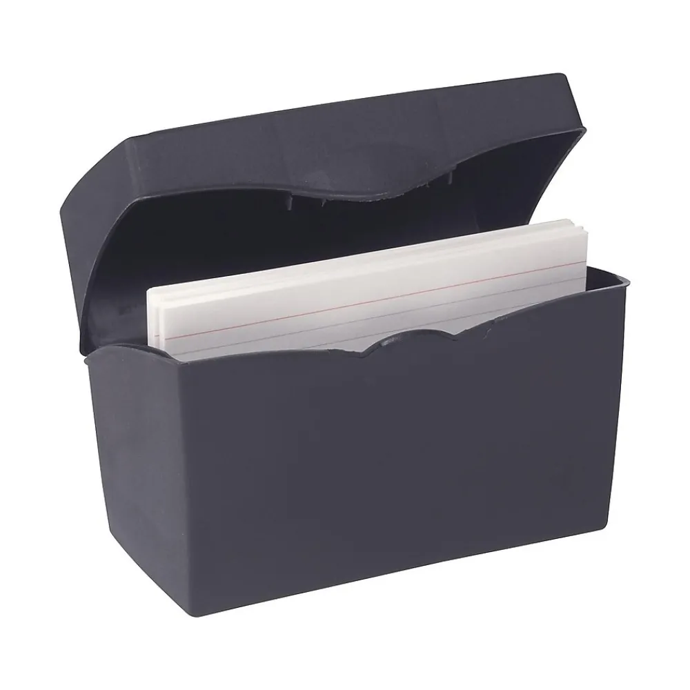 Organize notes, contacts or lists with this index card file. The compact size fits in a drawer or on a small desk, and the lid closes securely to keep items tucked safely away. The interior of this container and the lid feature a notched design to hold index cards upright and in place. With a low-profile look and neutral black color, this Staples index card file blends seamlessly with your other office accessories.