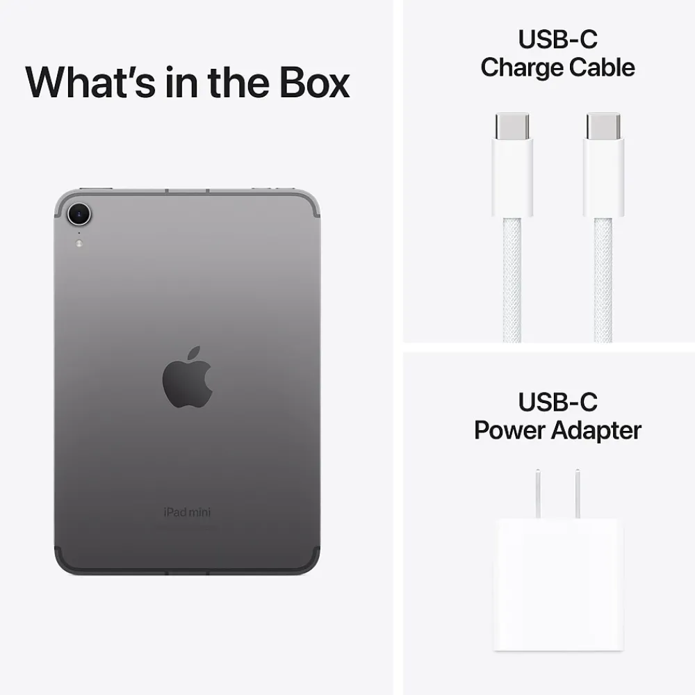 - What’s in the Box: iPad mini, USB-C Charge Cable, 20W USB-C Power Adapter