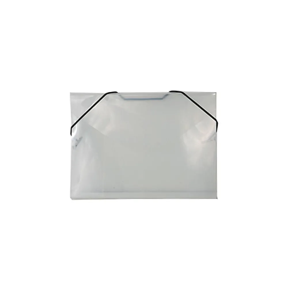JAM PaperĀ® Clear Index Size Portfolio with Elastic Closure measures 5 1/2 x 7 1/2 x 3/8 inches in size and is made out of smooth and durable transparent plastic. Sold individually, this clear portfolio case is great for keeping, organizing, and protecting indexes cards, notes, and more in any office, work space, or home. Its size makes it create for those flash cards you made for that upcoming test or for those keep-sake post cards from far away relatives. This portfolio has a rounded flap and an elastic band closure. A black strand of elastic string is attached at the back near the top and at the sides. The two loose portions of this string stretch around the front of the top two corners of the case to keep it closed.