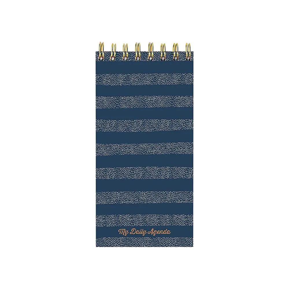 Navy and light blue stripes give this daily agenda a professional look which is still full of personality. Conveniently sized at 4″ x 8.5″, it is perfect for any on-the-go lifestyle. With the open-dated format, you can choose how structured your plans will be for a particular day. Each of the 130 lined perpetual sheets has a place to circle which day of the week it is and a place for the day’s date. Each sheet is also segmented into three sections: morning plans, afternoon plans, and etc. section for those extra daily reminders. The planner features wire-O binding that allows it to lay flat easily, a convenient flip between pages, and hard, durable front and back covers. Secured with an elastic band.
