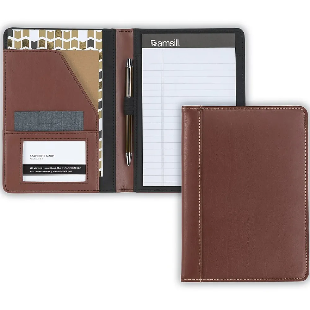 SamsillĀ® tan leather contrast stitch junior padfolio features interior document pocket, business card pocket, pen loop.