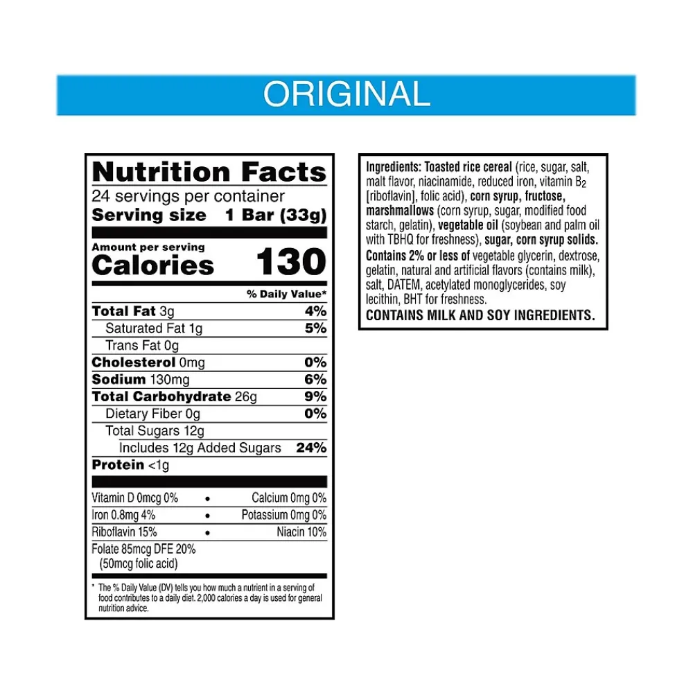 - Ingredients: toasted rice cereal (rice, sugar, salt, malt flavor, niacinamide, reduced iron, vitamin B2, folic acid), corn syrup, fructose, marshmallows (corn syrup, sugar, modified food starch, gelatin), vegetable oil (soybean and palm oil with TBHQ for freshness), sugar, corn syrup solids