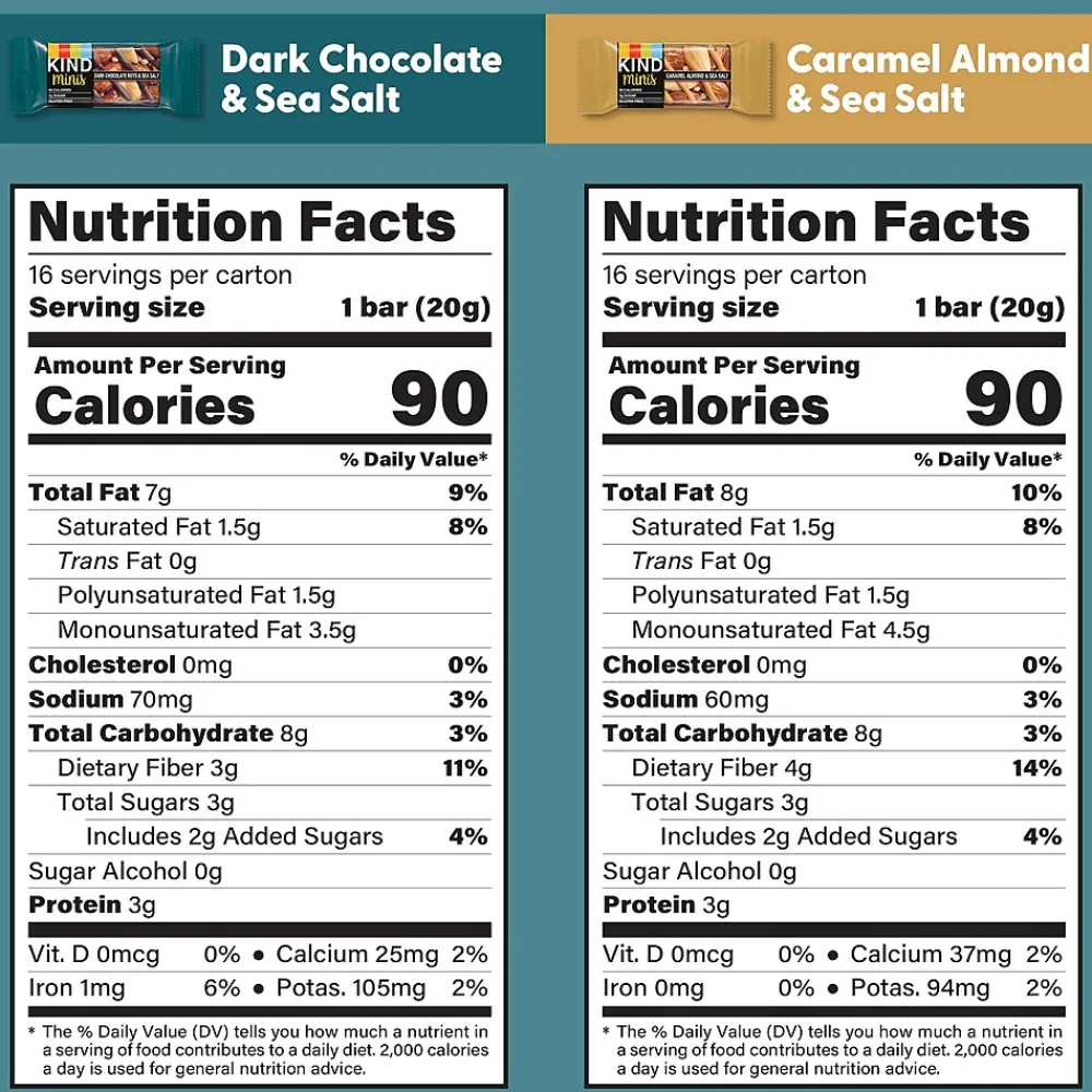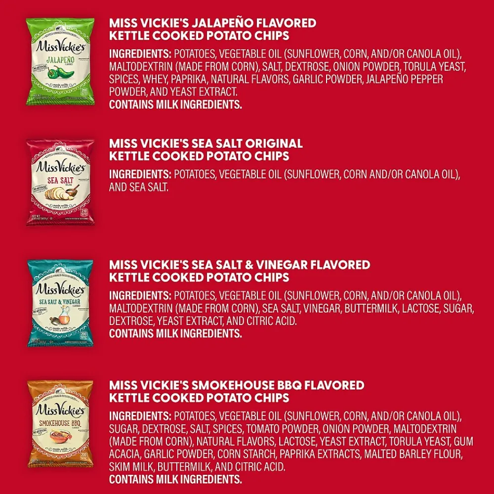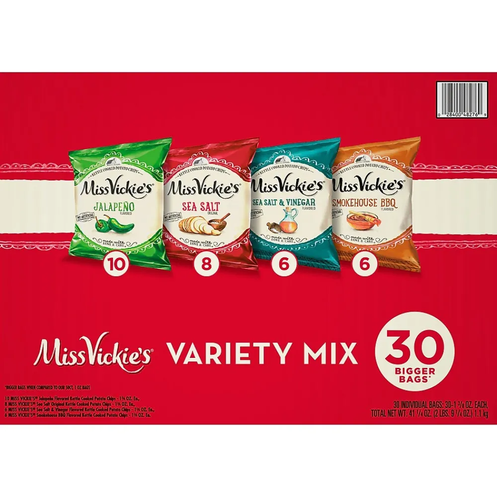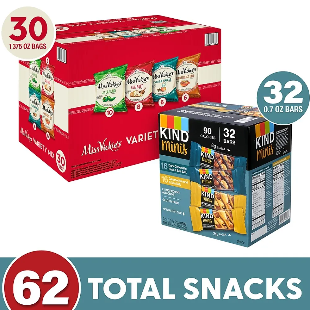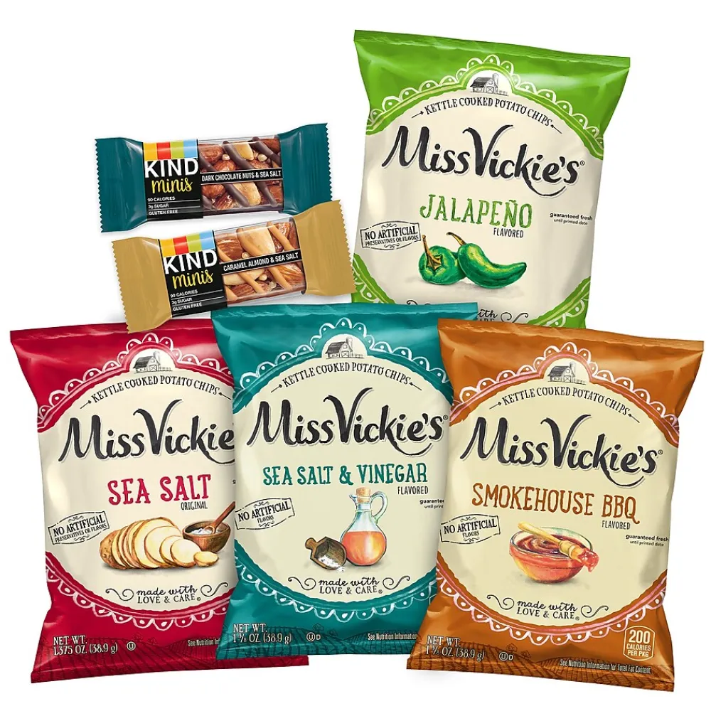 - KIND Minis Dark Chocolate Nuts & Sea Salt and Caramel Almond & Sea Salt Variety, 0.7 oz, 32 Count and MISS VICKIE’S Kettle Cooked Chips Variety Mix, 1.375 oz, 30 Count
