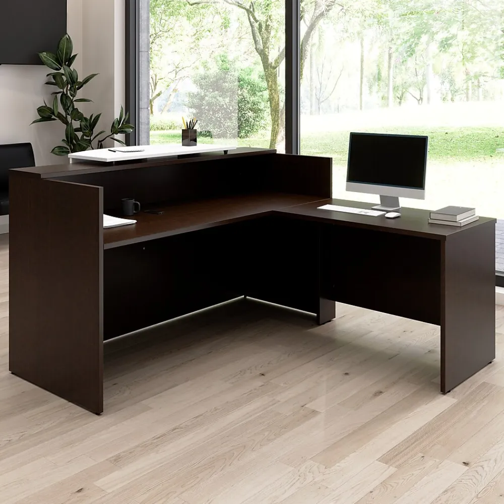 The Bush Business Furniture Arrive 72W x 72D L Shaped Reception Desk with Counter provides a stylish and practical solution for welcoming guests to your office’s waiting room. Greet visitors at a front desk that includes a raised shelf and counter that offer space to represent your business with a custom logo. The durable thermally fused laminate surface protects against scratches, stains, and other cosmetic damage to preserve the modern reception desk’s appearance throughout years of regular use. The L shaped desktop easily supports multiple monitors and other equipment with a 200-pound weight capacity and built-in wire management grommets. This commercial-grade L receptionist desk has been meticulously tested to meet or exceed ANSI/BIFMA standards for safety, durability, and performance and is backed by a 10 Year Manufacturer’s Warranty. American made with U.S. and imported parts.