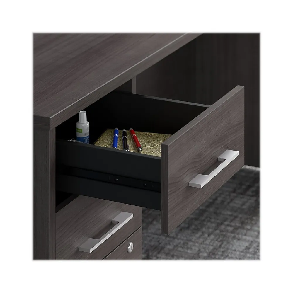 The Bush Business Furniture Office 500 71″W L-shaped executive desk with drawers provides a modern workspace with professional style and quality. Highlighted by its distinctive breakfront design, the Bush Business Furniture Office 500 71″W L-shaped executive desk with drawers presents a workspace that showcases the style and personality of the today’s professional. Take a prominent position in your private office as you get to work on a spacious right- or left-handed desktop with built-in wire management. This L-shaped computer desk supports multiple monitors and other equipment with a weight capacity of 200 lbs. Two file cabinets fit underneath the desk for easy access to legal-, letter-, and A4-size paperwork and supplies. All three file drawers and one of two box drawers can be locked to secure sensitive documents and personal items. This L-shaped desk with storage is tested to meet ANSI/BIFMA standards for safety and performance and is backed by a 10-year manufacturer limited warranty. American-made with US and imported parts.