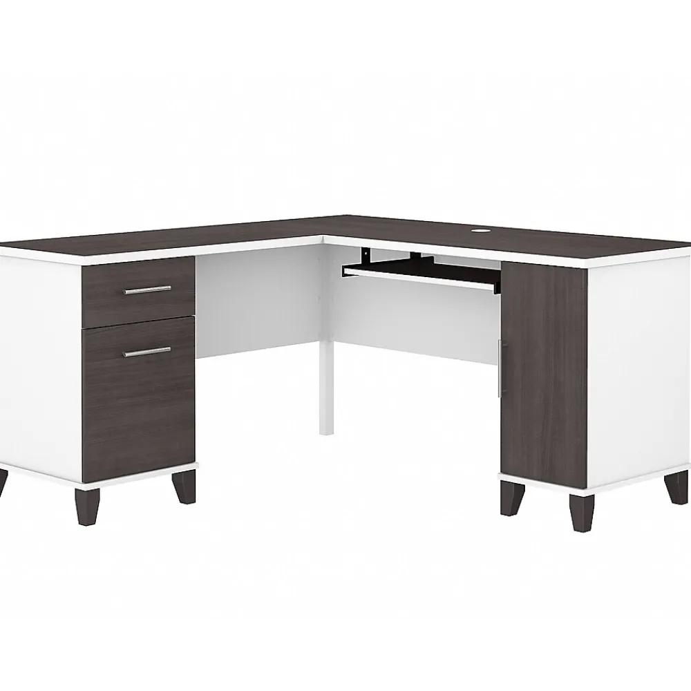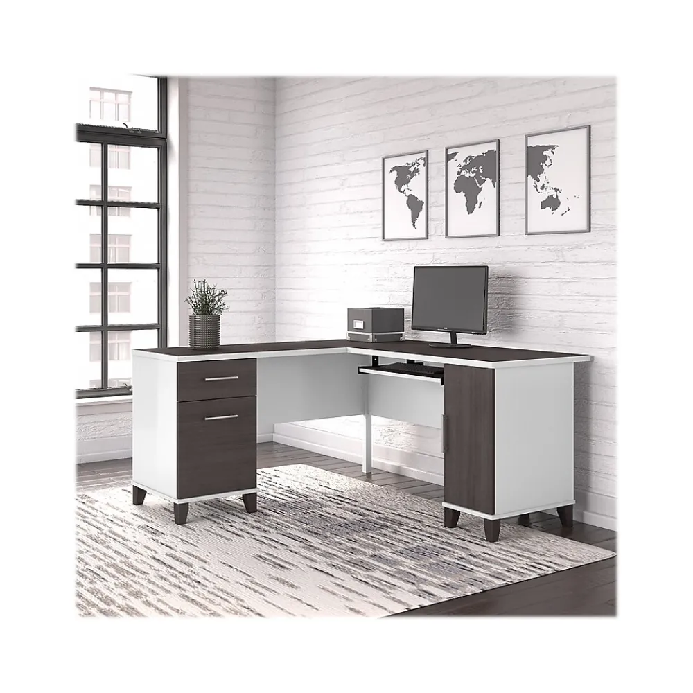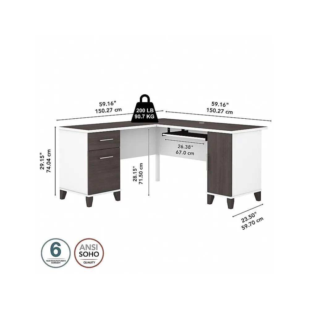 Maximize the potential of your home office with the Bush Furniture Somerset 60″W L-shaped desk. Create your remote work headquarters with space for a computer, phone, printer, and more on a surface that features wire management slots for keeping cords and cables in order. A convenient pull-out shelf provides a perfect place to keep a keyboard or laptop, and the desk also includes a vertical storage cabinet with an adjustable shelf. Place pens, paper, and more in the box drawer, and enjoy a file drawer gliding on smooth, ball-bearing slides for an easy reach to documents. Transitional styling includes a stylish finish with tapered legs and contemporary metal hardware for an alluring appearance. This desk with storage is tested to meet ANSI/SOHO standards for safety and performance and is backed by the 6-year manufacturer warranty. American-made with US and imported parts.