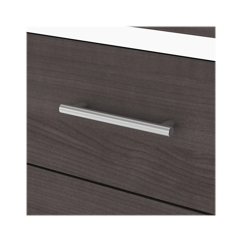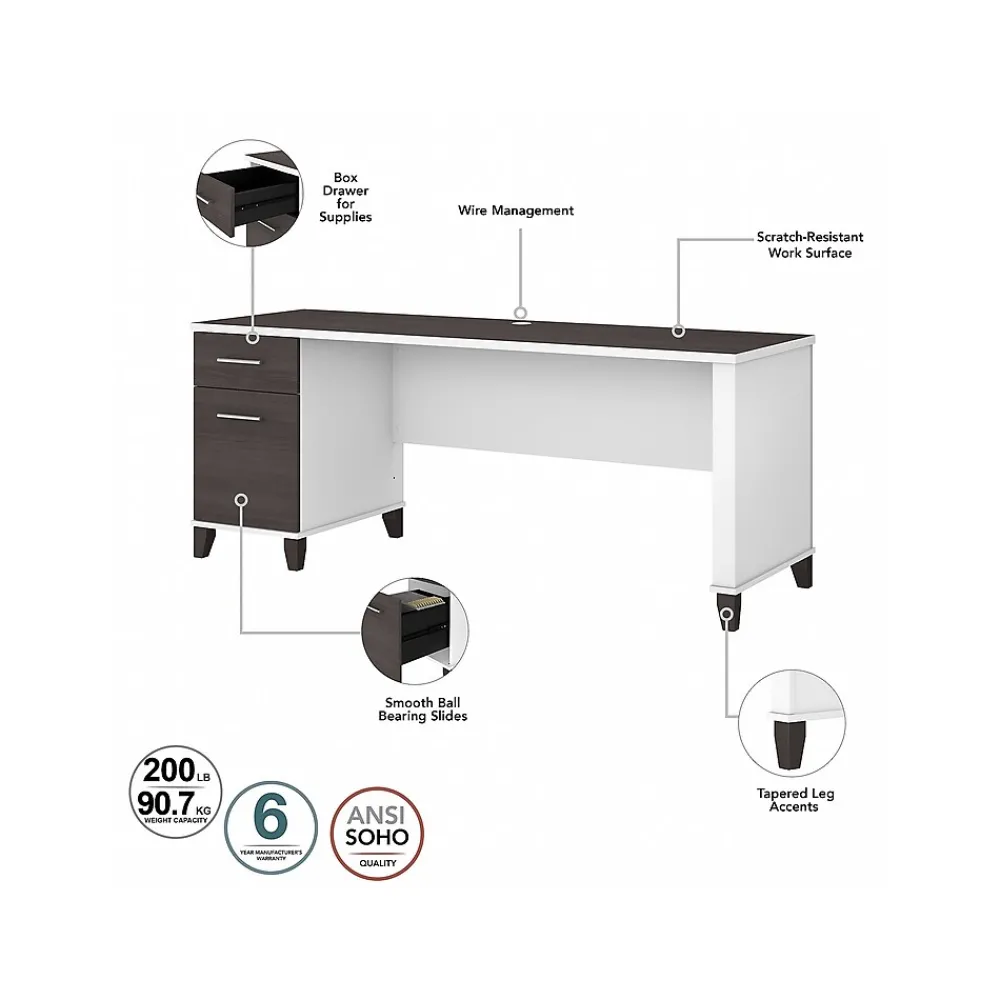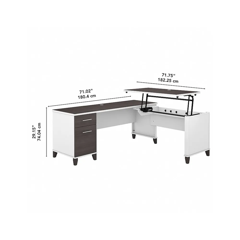 Upgrade your personal workspace with the ergonomic Bush Furniture Somerset three-position sit-to-stand L-shaped desk. As a quality alternative to desktop risers, the innovative 42″W x 24″D sit-to-stand return offers all the health benefits of a standing desk with the versatility of more expansive electric height-adjustable options. The built-in mechanical lift-and-lock system allows the desktop to lock into place at standing heights of 35″, 38″, and 41″ and easily returns to a seated position. The office desk includes a file drawer that opens on full-extension ball bearing slides for easy access to legal- and letter-size documents in addition to a box drawer for supplies and utensils. Fixed surfaces are tested to meet ANSI/SOHO standards for safety and performance while the mechanical lift is rigorously tested to Bush Furniture quality standards.