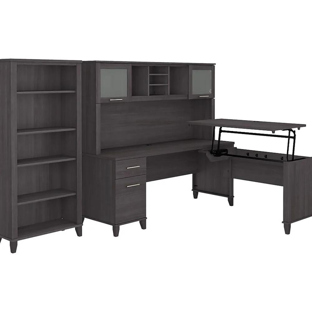 - Bundle includes: 71″W office desk with drawers, 42″W sit to stand return, 71″W hutch, 30″W five-shelf bookcase