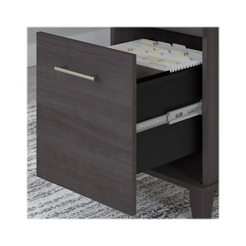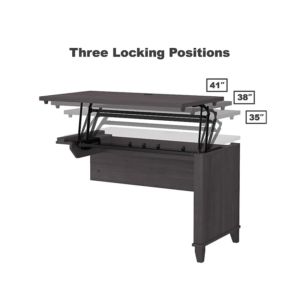 The Bush Furniture Somerset adjustable desk with hutch and bookcase offers an ergonomic solution for the home or small office. This furniture set is a perfect solution for those seeking for a stylish and functional ergonomic workspace. The mechanical Lift-n-Lock system allows the 42″W x 24″D return to lock into place at standing heights of 35″, 38″, and 41″ and easily return to a seated position. The 71″W x 24″D office desk has its own storage with a box drawer for supplies and a file drawer that holds legal- and letter-size documents. The hutch adds two frosted glass doors for concealed storage as well as open cubby spaces with two shelves. The bookcase features two fixed shelves and three shelves that can be adjusted. Fixed surfaces are tested to meet ANSI/SOHO standards for safety and performance while the mechanical lift is rigorously tested to Bush Furniture’s own quality standards. Backed by a 6-year manufacturer warranty.