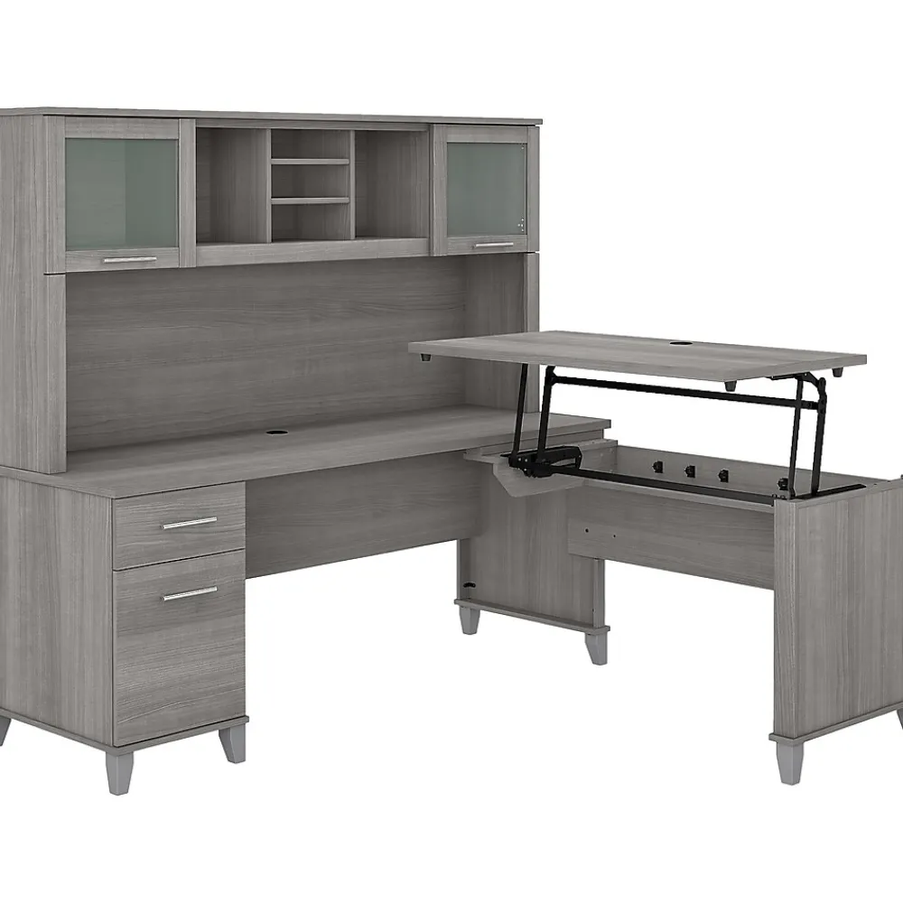 The Bush Furniture Somerset 72″W three-position sit to stand L-shaped desk with hutch offers a perfect solution for those seeking for a stylish and functional ergonomic workspace. The built-in mechanical Lift-n-Lock system allows the desktop to lock into place at standing heights of 35″, 38″, and 41″ and easily return to a seated position. This office desk includes a file drawer that opens on full-extension ball bearing slides for easy access to legal- and letter-size documents and a box drawer for supplies and utensils. The hutch attaches to the desktop and adds two frosted glass doors for concealed storage in addition to open cubby spaces with two shelves. Fixed surfaces are tested to meet ANSI/SOHO standards for safety and performance while the mechanical lift is rigorously tested to Bush Furniture quality standards.