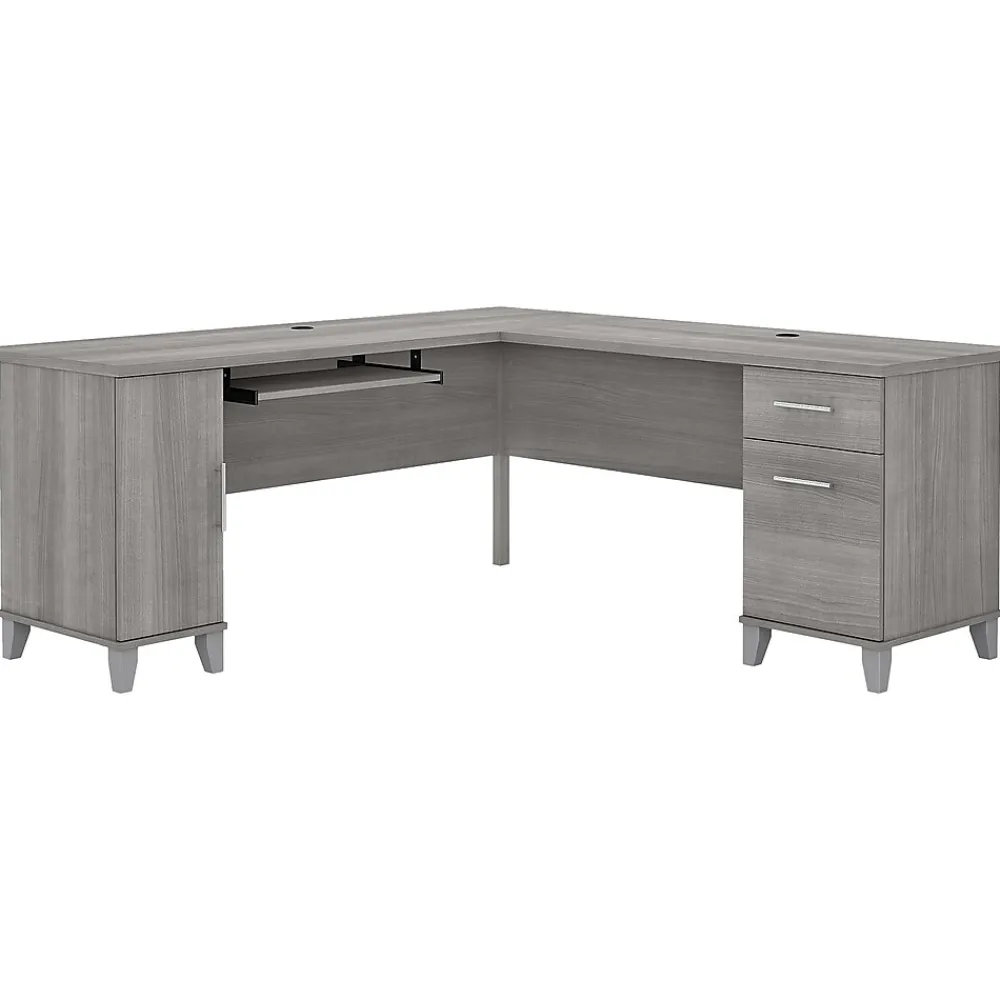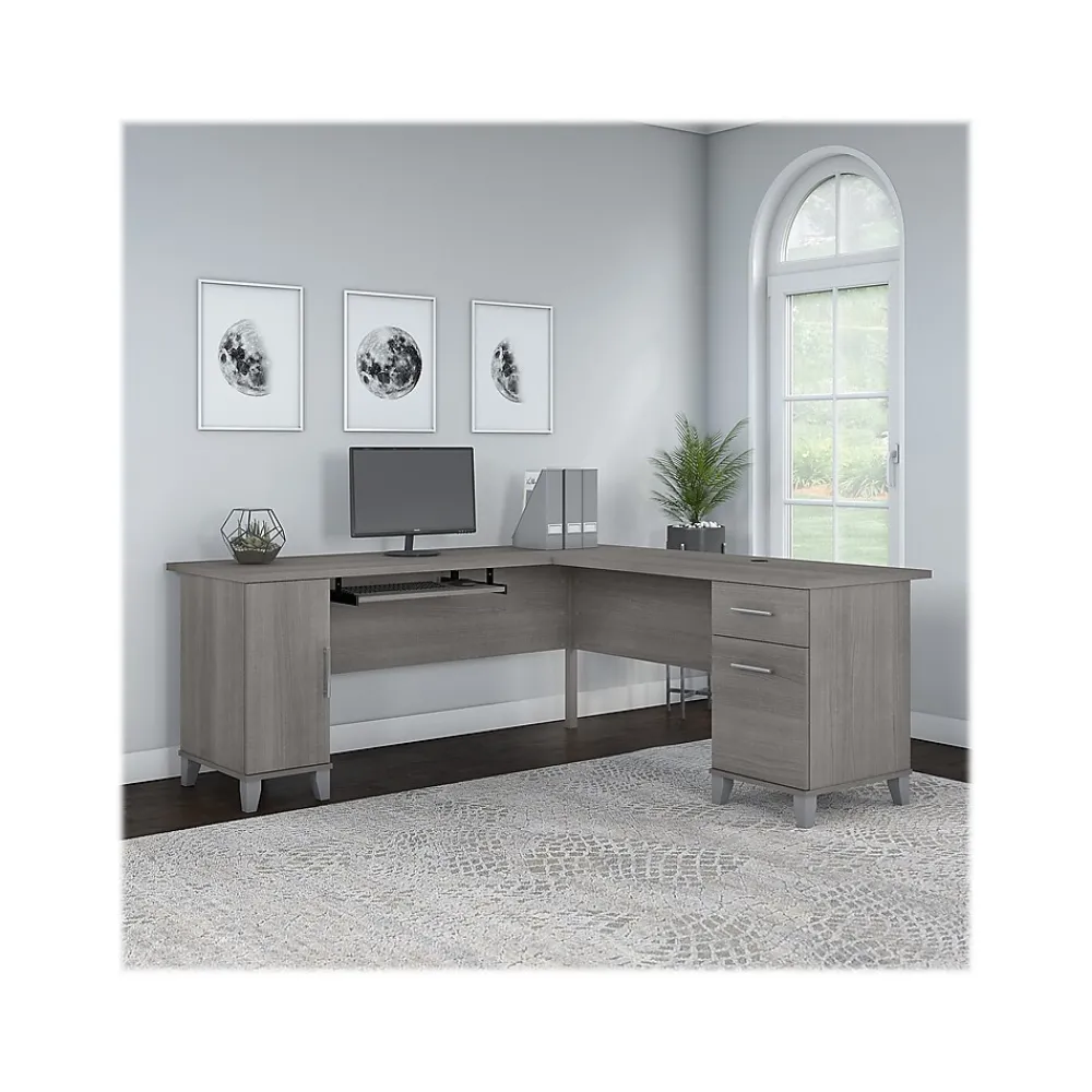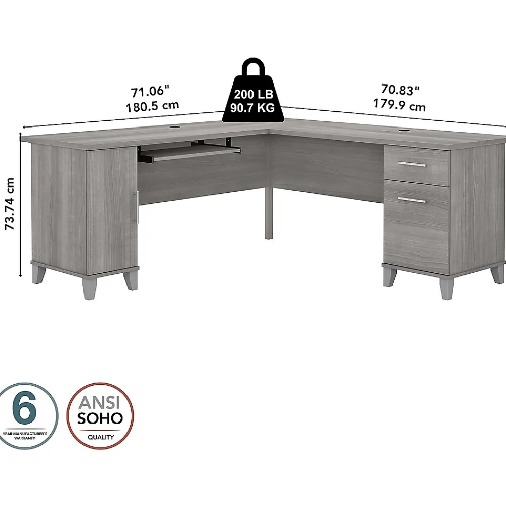 Build your home office around the Bush Furniture Somerset 72″W L-shaped desk with storage, featuring transitional style and plenty of space for materials. Maximize the potential of your home office with this desk. Create your remote work headquarters with space for a computer, phone, printer, and more on a surface that features wire management grommets for keeping cords and cables in order. A convenient pull-out tray provides a perfect place to keep a keyboard or laptop, and the desk also includes a vertical storage cabinet with an adjustable shelf. Place pens, paper, and more in the box drawer, and enjoy a file drawer gliding on smooth ball bearing slides for an easy reach to documents. Transitional styling offers an elegant finish with tapered legs and contemporary metal hardware for an alluring appearance. This desk with storage is tested to meet ANSI/SOHO standards for safety and performance and is backed by the Bush Furniture 6-year manufacturer warranty. American-made with US and imported parts.