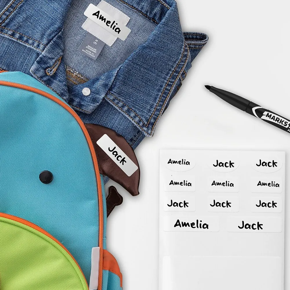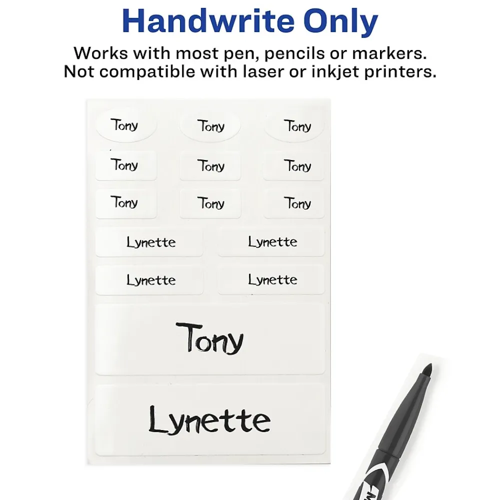 Make sure clothing and supplies always get returned to its rightful owner with Avery 40700 No-Iron Fabric Labels. Just handwrite on the clothes labels with a permanent marker, peel and apply. It’s that simple! Labels are not compatible with printers. The label’s white background makes it easy to see the writing on your label for quick and effortless identification. You don’t even have to worry about labels lifting, curling, or falling off thanks to permanent adhesive that is guaranteed to stay in place. The no-iron clothing labels are flexible and durable enough to withstand multiple cycles in your washer and dryer. Not only do they make great name labels for clothing for school, daycare, nursing homes and work, but their unique material allows you to apply the labels to other smooth surfaces. Use labels on office and school supplies, water bottles, lunch boxes, storage bins, cups and bottles, camping gear and more. Item includes a total of 45 matte white oval labels and rectangle labels in various sizes.