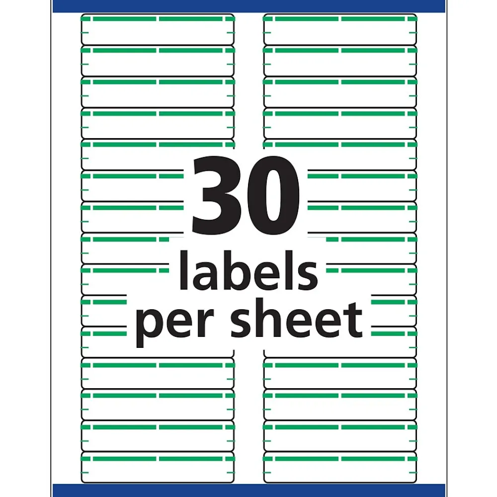 Color code your file folders, documents and binders with these file folder labels featuring green accents. Printable labels are engineered with Sure Feed(R) technology for a reliable feed through your printer, preventing jams and misalignments—and no more wasted labels. Save money reusing file folders with these labels featuring TrueBlock(R) technology. Labels are designed to completely cover up everything underneath, from markings to existing labels, and are guaranteed to stick and stay without curling or lifting. Custom file folder labels are available in a variety of colors. The green file folder labels 1/3 cut tabs can also be used for projects such as identifying objects and organizing containers. Customize with free templates on Avery(R) Design & Print (avery.com/templates) to create your own filing system. Printable with laser and inkjet printers.