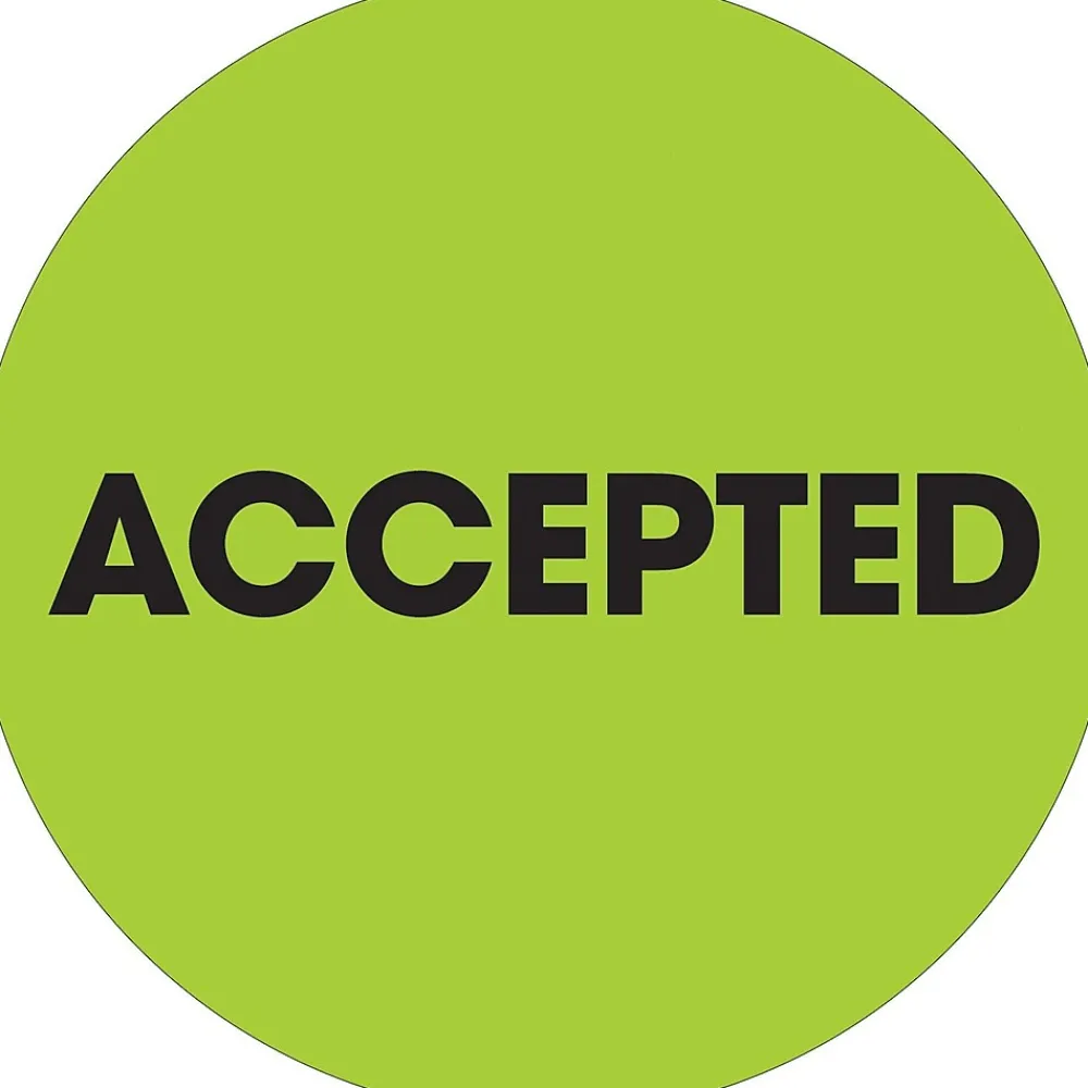 Tape Logicâ„¢ 2″ “Accepted” Labelin fluorescent green color is printed with black color text. Label in circular shape has pressure sensitive adhesive for quick attachment on any surface, sold as 500 per roll.
