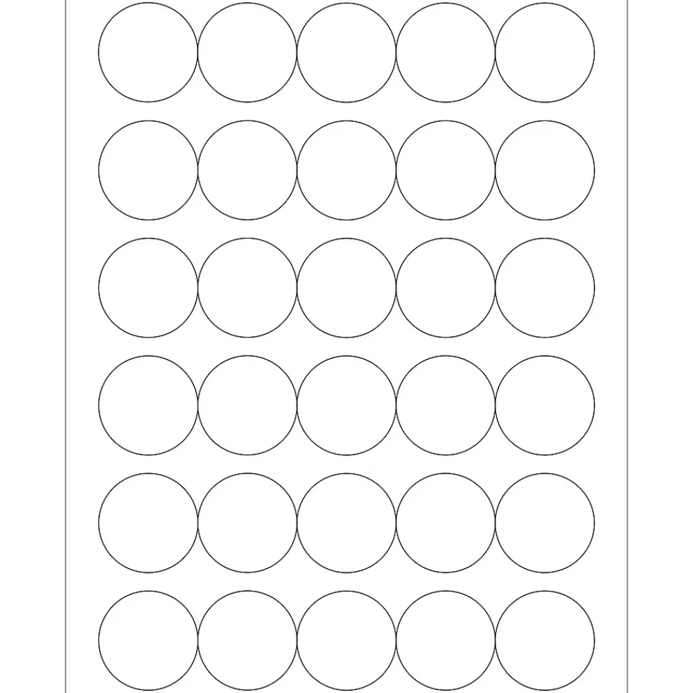 1 1/2″ White Circle Laser Labels. Use to create your own product or mailing labels. Labels work with both laser and ink jet printers. Permanent adhesive. Labels stick to a variety of smooth surfaces including paper, corrugated, plastic, wood, glass and metal.