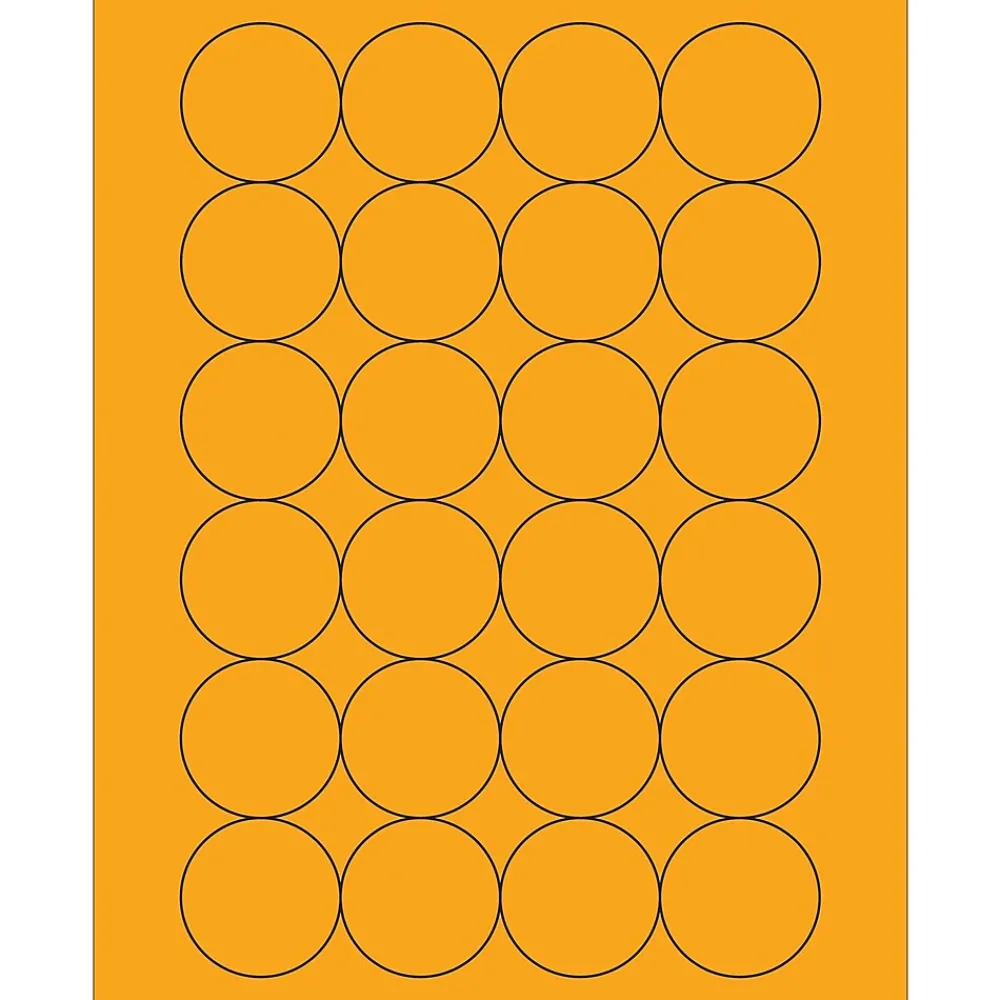 1 2/3″ Fluorescent Orange Circle Laser Labels. Use to create your own product or mailing labels. Labels work with both laser and ink jet printers. Permanent adhesive. Labels stick to a variety of smooth surfaces including paper, corrugated, plastic, wood, glass and metal.