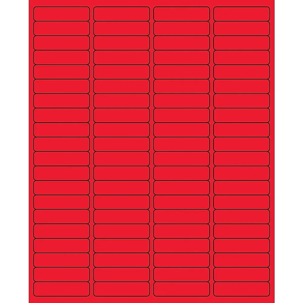 1 15/16 x 1/2″ Fluorescent Red Rectangle Laser Labels. Use to create your own product or mailing labels. Labels work with both laser and ink jet printers. Permanent adhesive. Labels stick to a variety of smooth surfaces including paper, corrugated, plastic, wood, glass and metal.