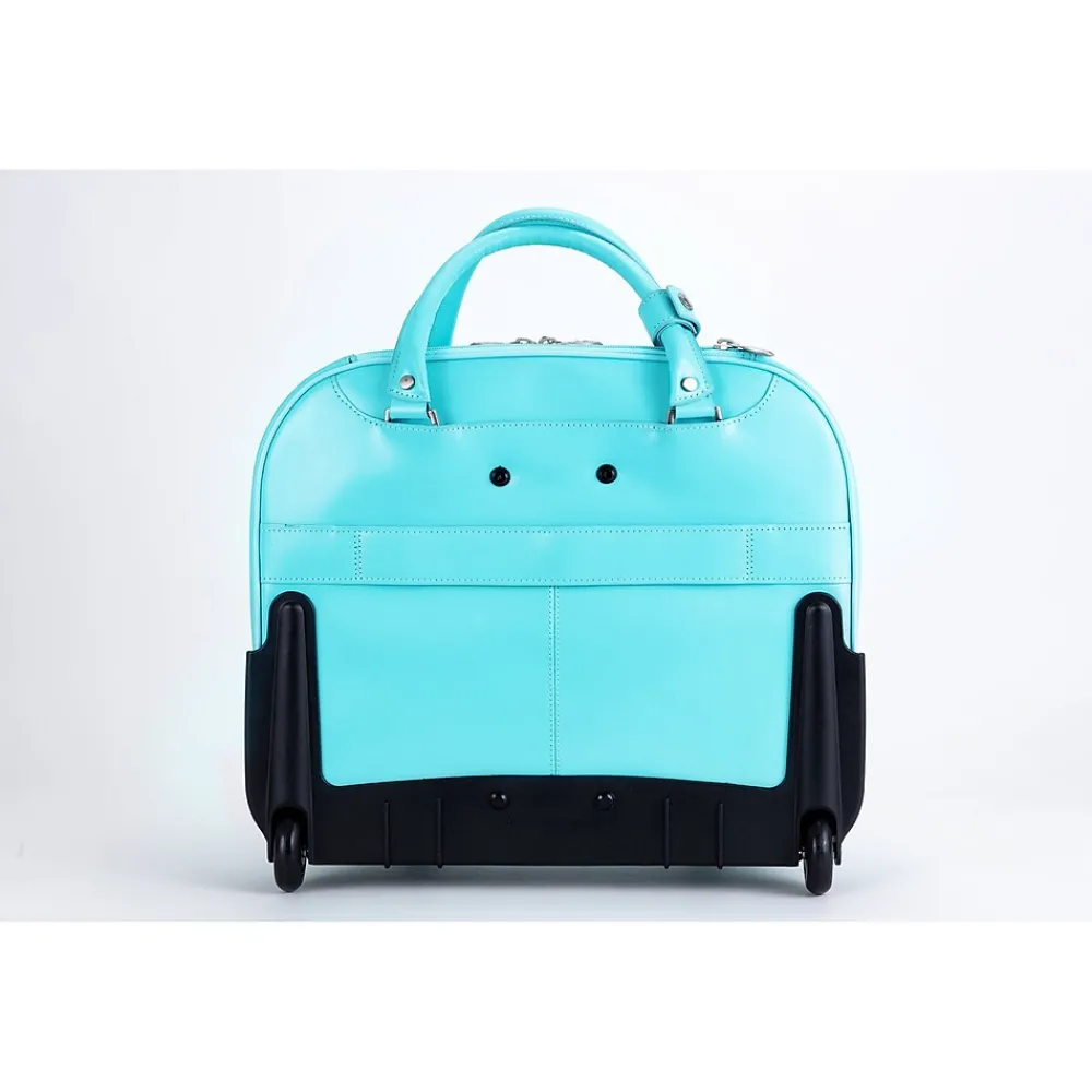 The McKlein DENALI wheeled briefcase features a quick-access front pocket secured by a key lock and containing an organizer for business cards, pens, and accessories. A small front pocket is secured by a flap with turn lock, while a built-in high-density laptop compartment protects laptops up to 15″ in size. The case also offers three slip pockets for power cords, media devices and accessories, and a double compartment divided by an accordion expandable file for important documents. A smart strap allows for easy transport on extended handles of other rolling cases and luggage.