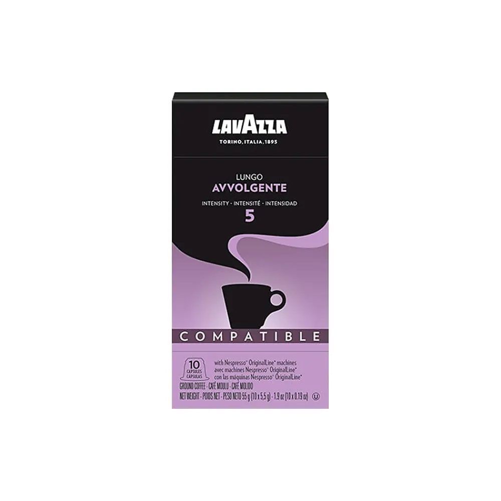 The round taste of the grains from Central and South America blends with the sophisticated aromatic taste of the coffee beans of African arabica to create a mixture with a velvety, rounded, and full-bodied flavor. The dark roasting and a touch of robusta from the regions of Southeast Asia give an aromatic balance that reveals precious hints of cocoa and spicy nuances. The Lavazza Lungo Avvolgente coffee capsule is compatible with Nespresso Original machines.