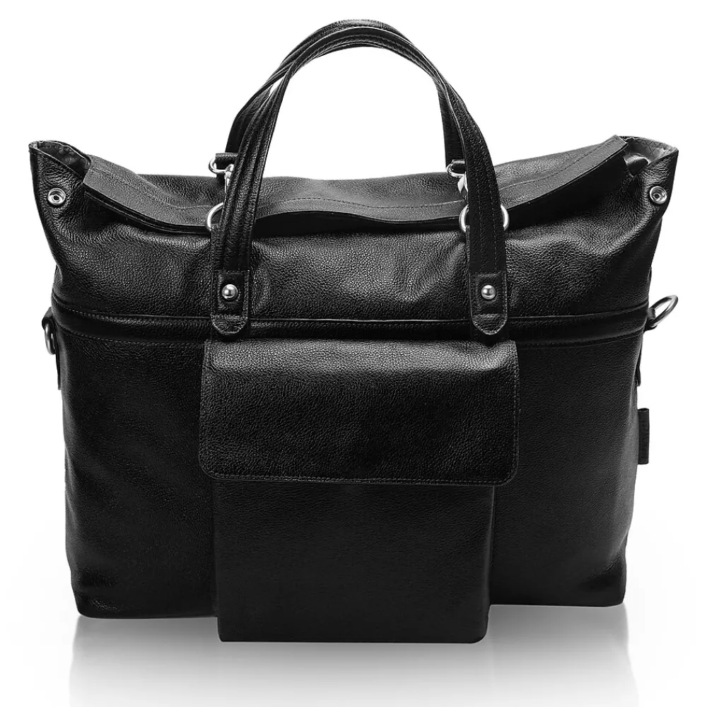 Leather Roll Top Laptop Briefcase with dual clasps closure. Front easy access pocket with flap over magnetic closure. Fully-lined interior with leather trim and silver accent hardware. Interior compartment features built-in laptop protection, tablet pocket and organizer for business cards, pens, and accessories. Back features secured zipper pocket. Removable and adjustable nylon strap with leather shoulder pad. Leather smart strap for piggy-backing onto rolling cases.