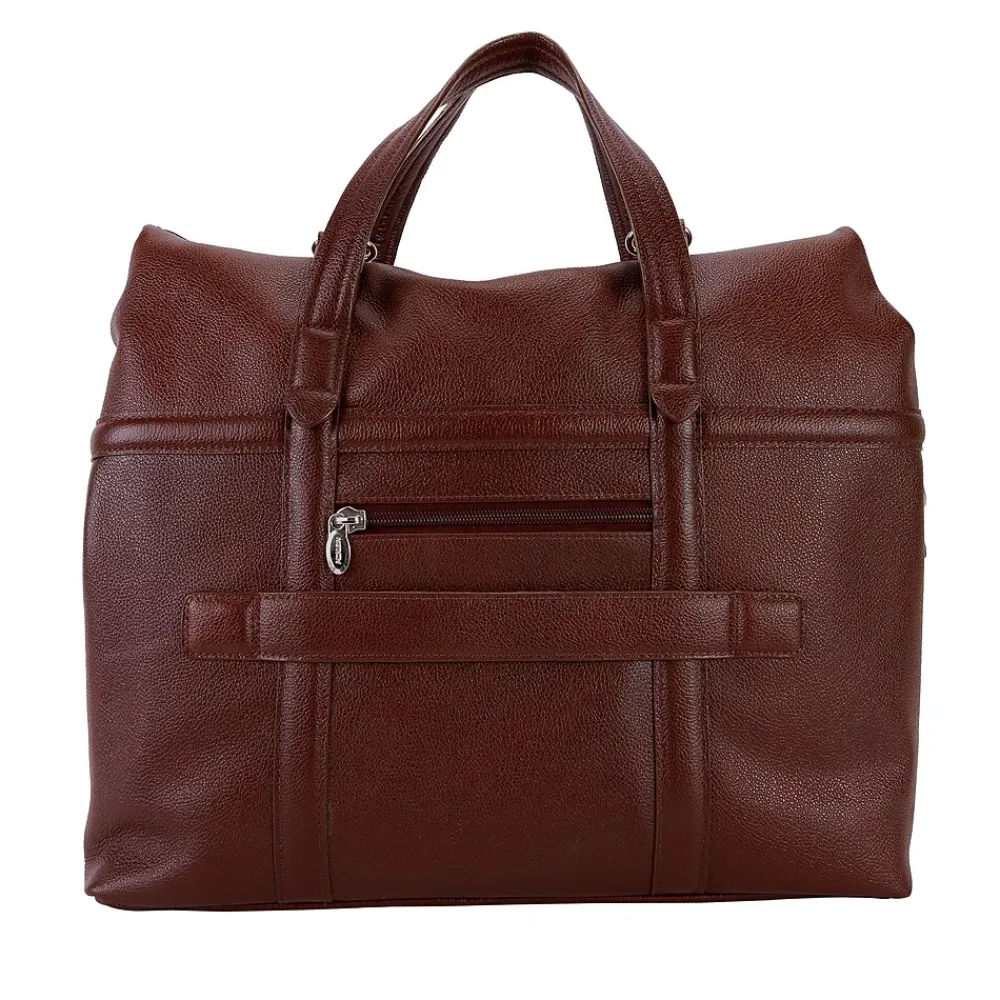 Leather Roll Top Laptop Briefcase with dual clasps closure. Front easy access pocket with flap over magnetic closure. Fully-lined interior with leather trim and silver accent hardware. Interior compartment features built-in laptop protection, tablet pocket and organizer for business cards, pens, and accessories. Back features secured zipper pocket. Removable and adjustable nylon strap with leather shoulder pad. Leather smart strap for piggy-backing onto rolling cases.