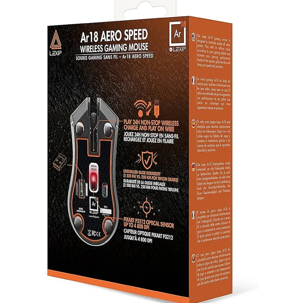 Play efficiently, wired or wirelessly, with the Lexip Ar18 Aero Speed mouse. Easily change its sensitivity (DPI) with the dedicated button designed to avoid any «misclick» and gain speed/ precision thanks to the ceramic pads!