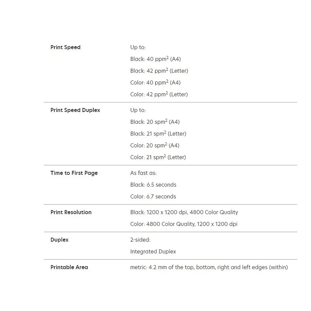 - Print Speed: Up to 42 ppm
