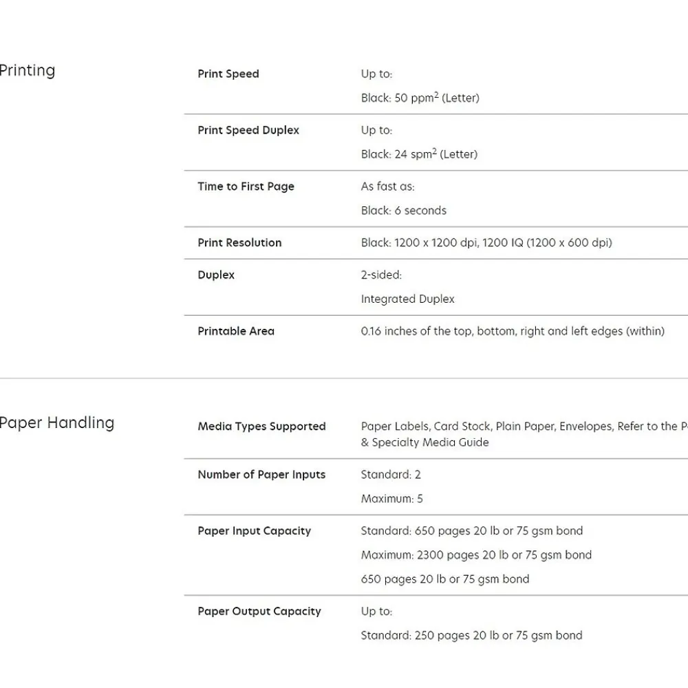 | Automatic Document Feeder (ADF) Print Speed, measured in pages per minute (PPM), specifies the amount of black and white pages that the printer can produce within 60 seconds. | 41 PPM & Up |