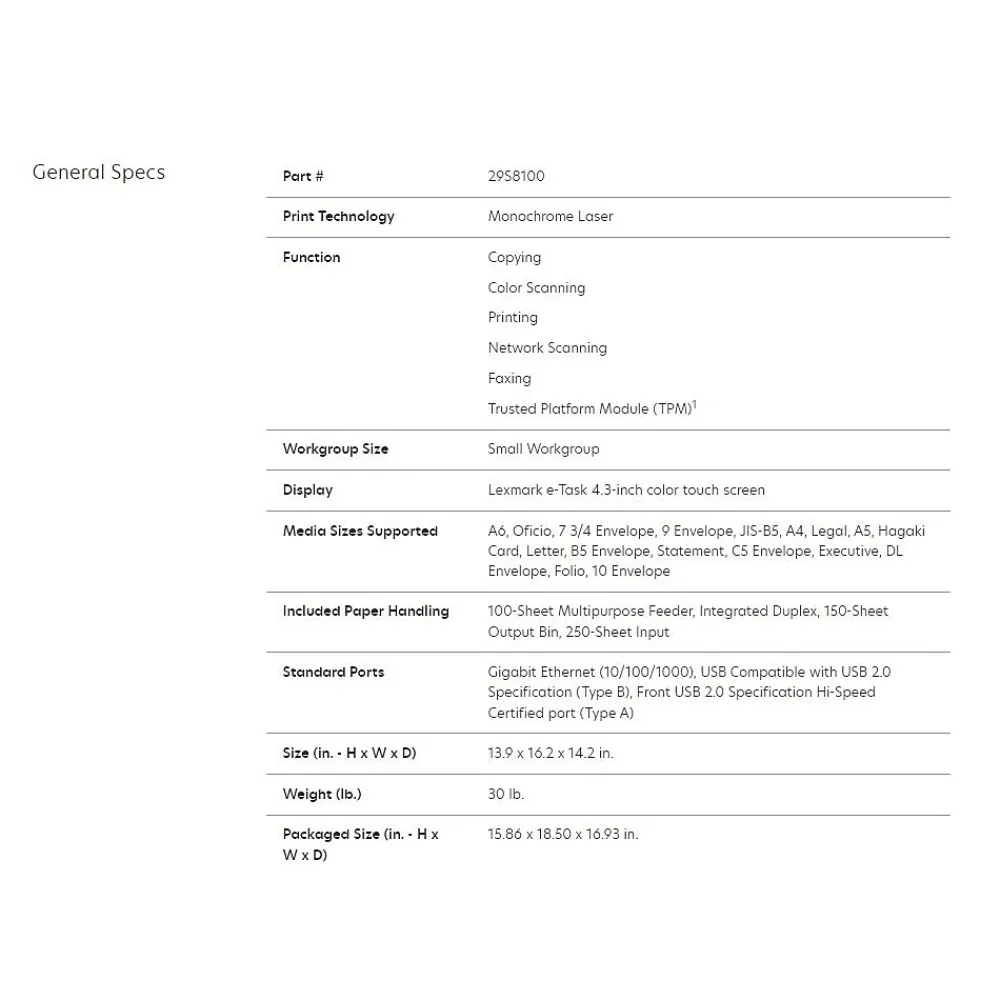 | Network Ready Specifies if the printer’s output is either black and white (also referred to as monochrome), or color. | Black & White |